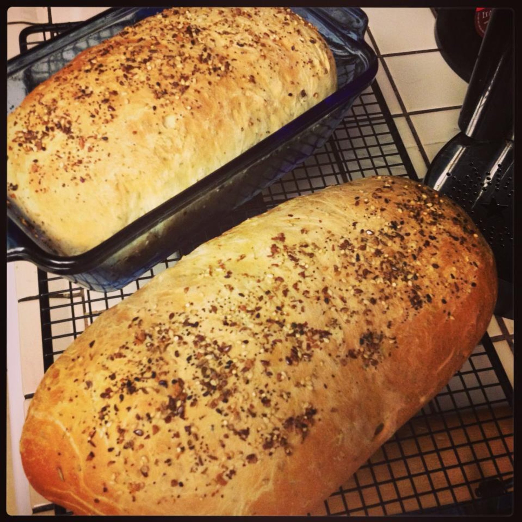 Bake in a 375 degree F oven for about 35 minutes until nice and browned. If you'd like to add some seeds to the top (sesame or a seed mix, you can add to the top.) Allow to cool about 20 minutes before slicing. I based this recipe on 16 slices per loaf, 2 loaves. 1 slice (1/16th of a loaf) = 3 WeightWatchers Points Plus per serving.