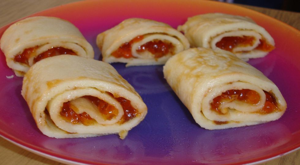 Mix 3 eggs, 0.5 liters of milk, 250 grams of flour, 2 tablespoons of vegetable oil, salt to taste, it should turn the dough like a thick cream. Fry thin pancakes. For each pancake put 1 teaspoon of red caviar, make rolls, cut into serving pieces.Mix 3 eggs, 0.5 liters of milk, 1 glass of flour, 2 table-spoons of vegetable oil, salt to taste, it should turn the dough like a thick cream. Fry thin pancakes. For each pancake put 1 teaspoon of red caviar, make rolls, cut into portions.