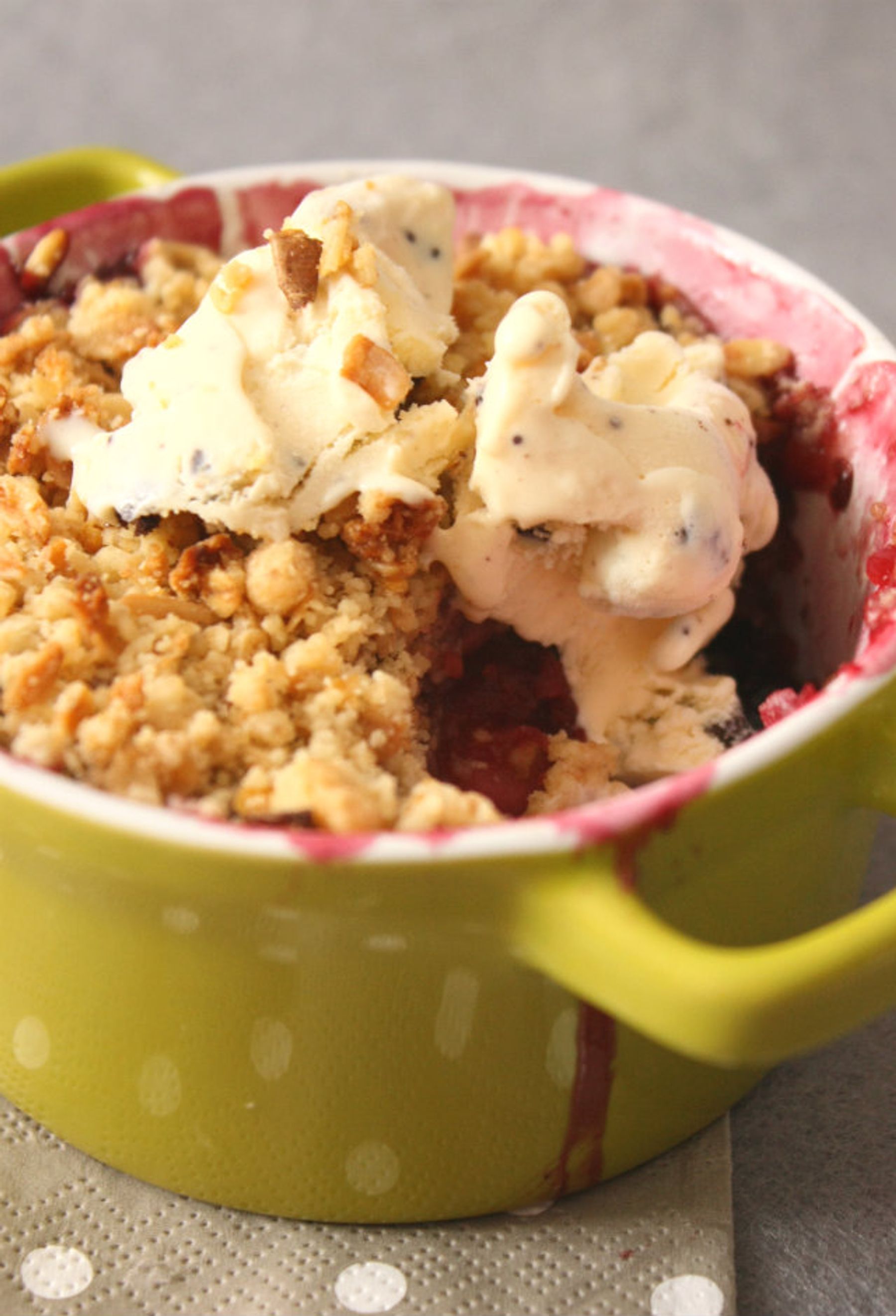 This recipe is perfect comfort food for those dark and cold autumn and winter days. The result is really delicious and I love the beautiful colour blackberries give to the crumble. Even my 1 year old loved it and asked for more!