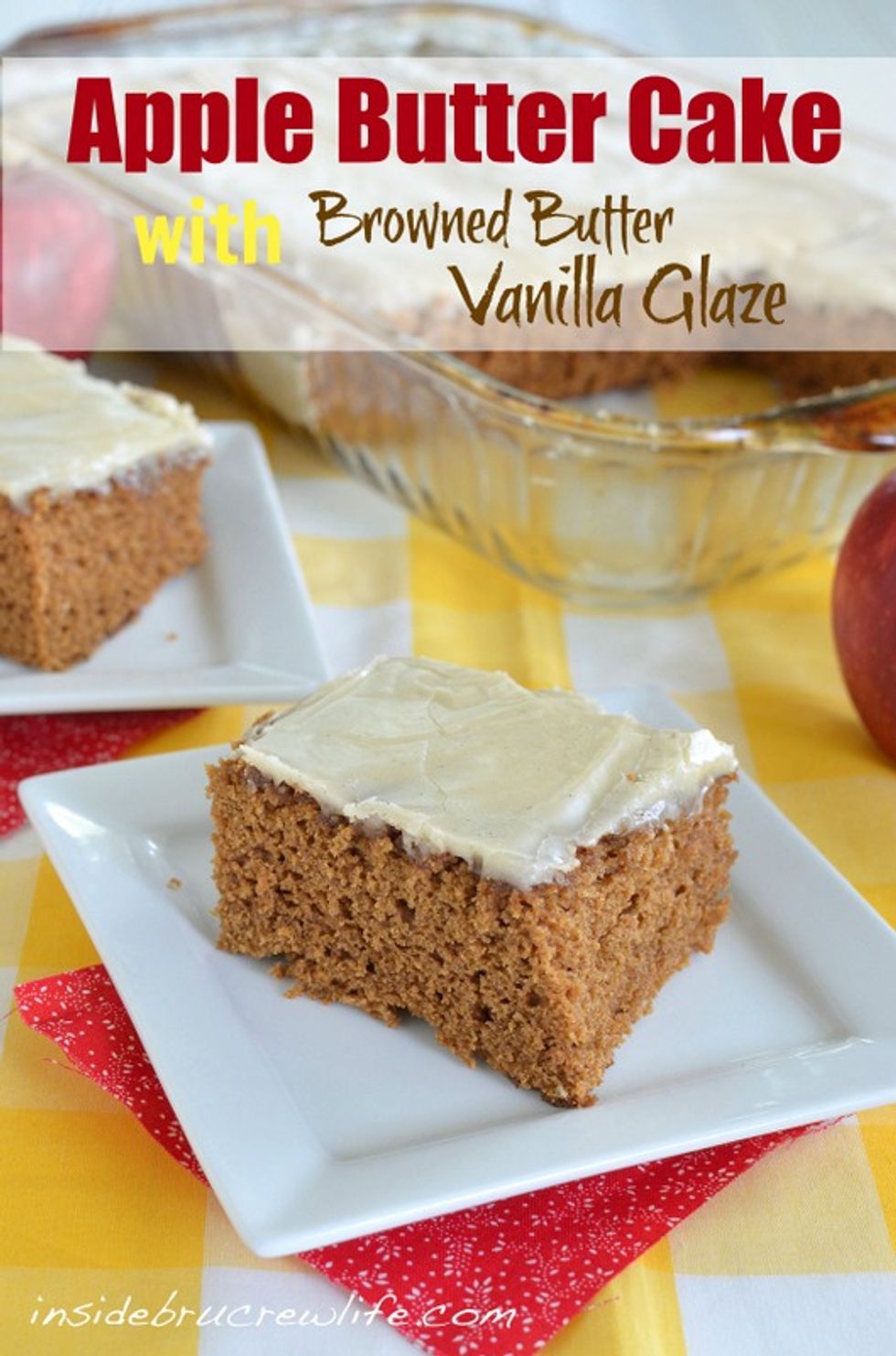 Warm apple butter cake topped with a browned butter vanilla glaze