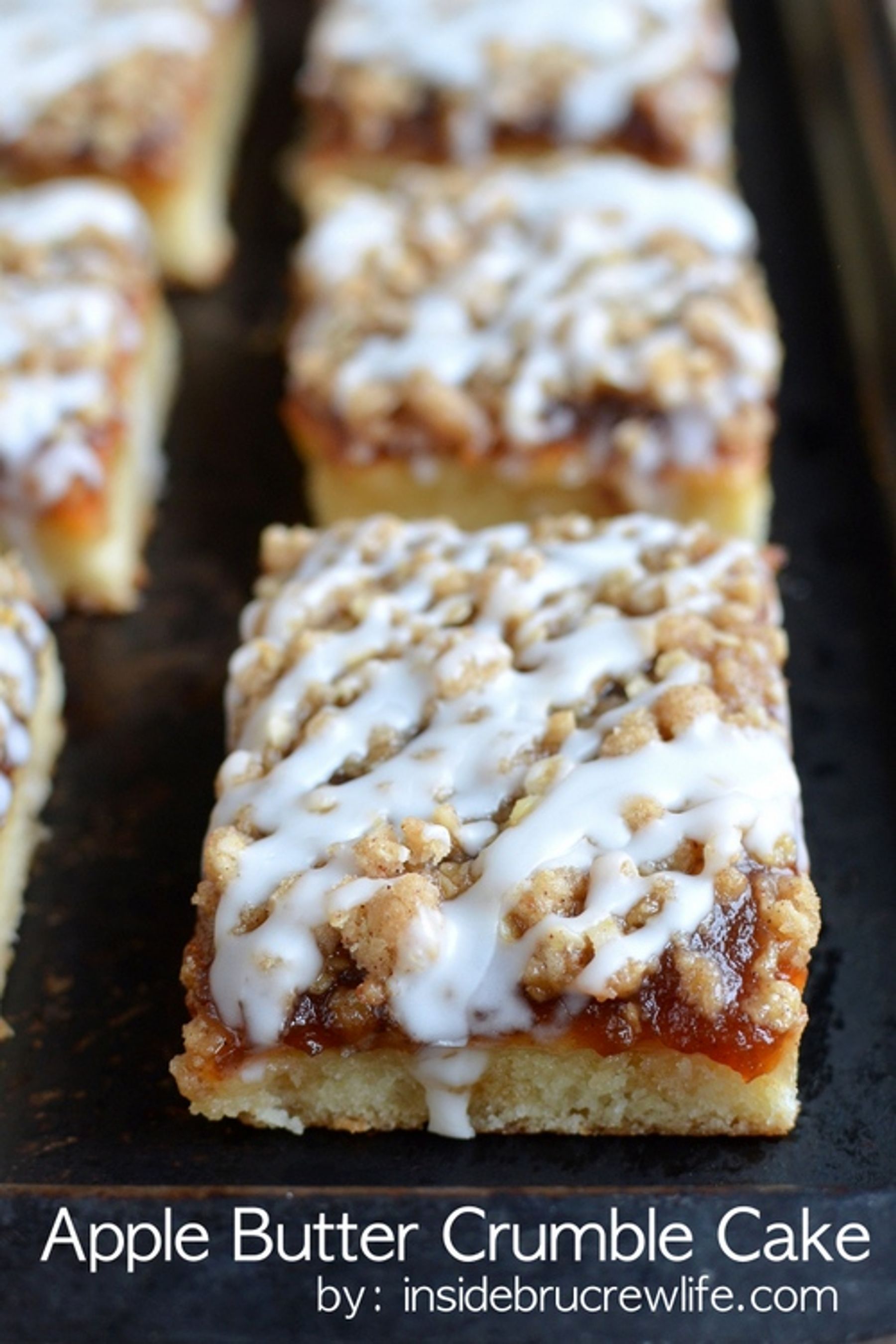 Soft buttery cake with a layer of apple butter and cinnamon crumble on top makes this the perfect fall cake.