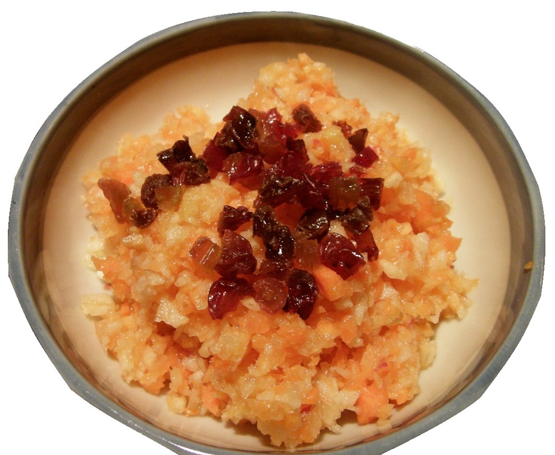 Mix apple and carrot mash in a bowl, pour orange juice over, then sprinkle with raisins.