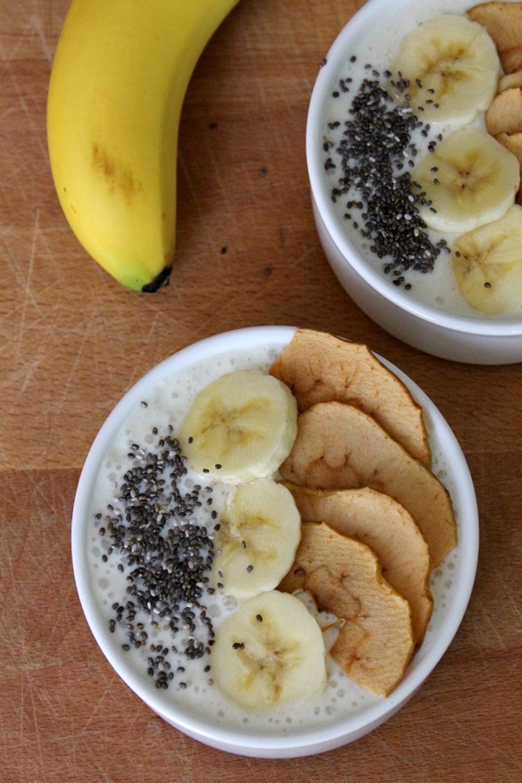 Top each with ½ teaspoon chai seeds, 3 banana slices, 4 apple chips.