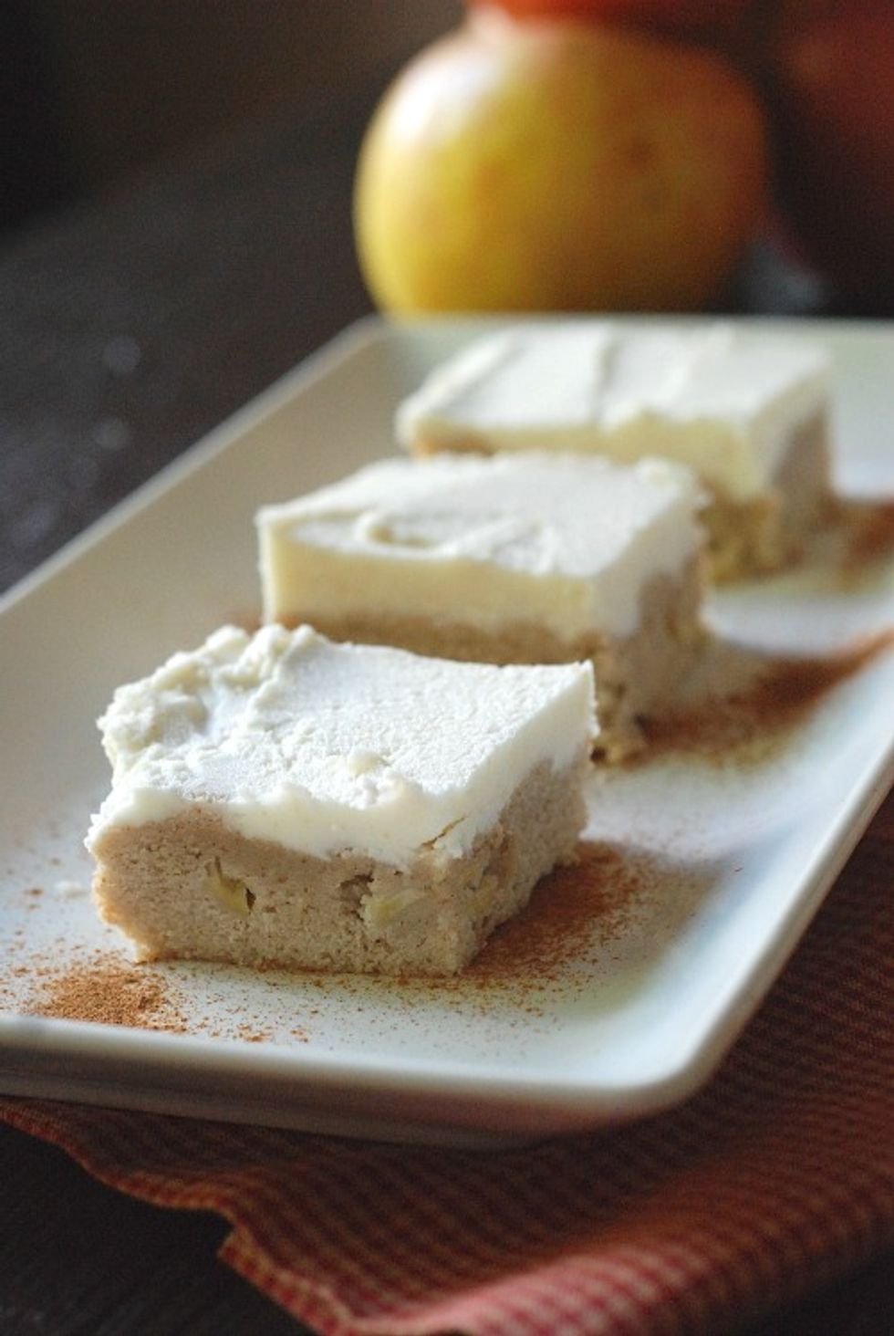 Sugar cookie bars loaded with apple chunks, lots of cinnamon and topped with a browned butter frosting.