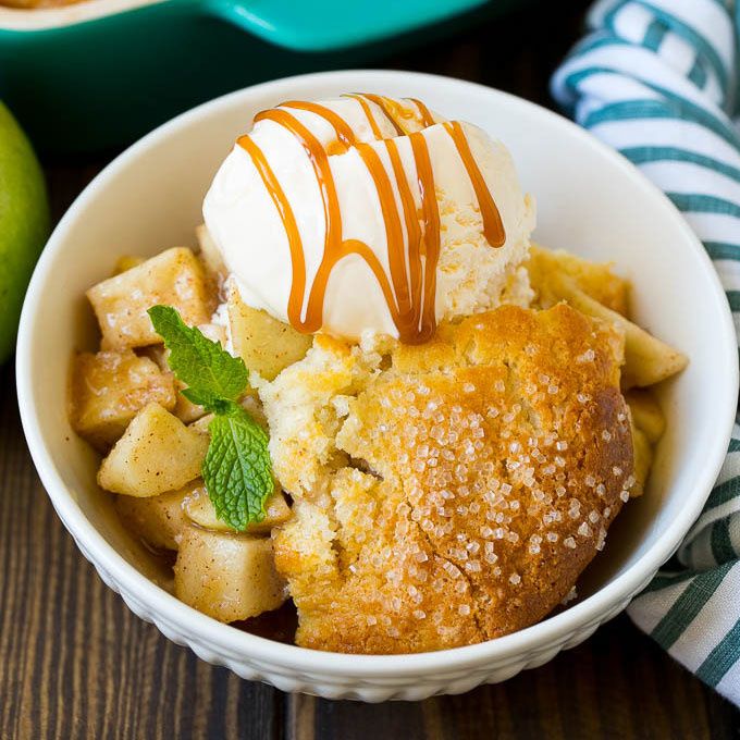 This apple cobbler is an old fashioned dessert made with an apple filling that is topped with sweet buttermilk biscuits. A quick and easy treat that's perfect to make when apples are in season!
