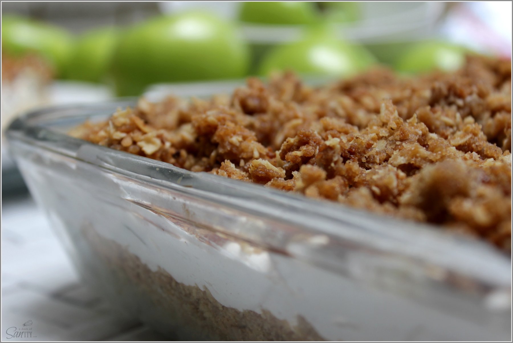 A new twist to the classic Apple Cobbler. A light and fluffy apple no bake cheese cake with a classic caramel crumb topping. Easy to assemble, make and even better when devoured & shared.