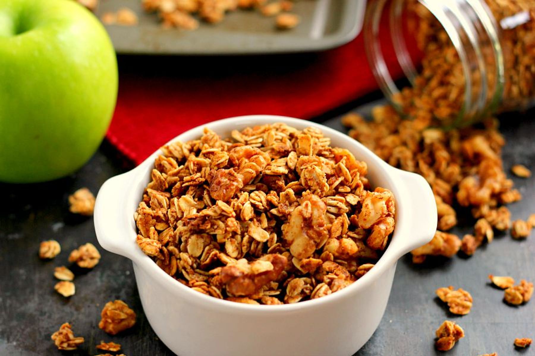 This Apple Pie Granola is jam-packed with hearty oats, walnuts, and cozy fall spices. It makes the perfect autumn snack and tastes like apple pie, in healthy form!