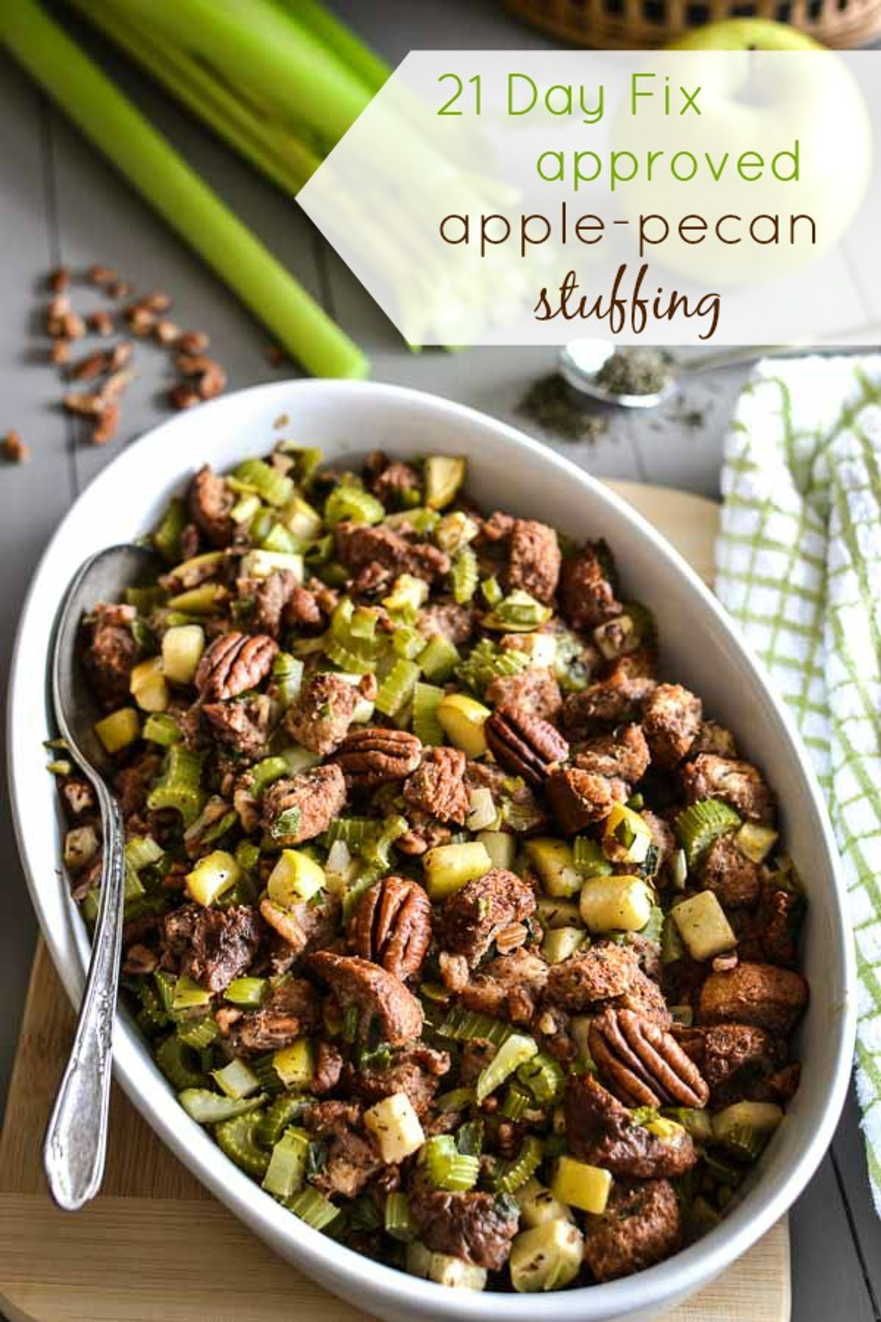 This delicious, flavorful stuffing uses 100% whole wheat bread instead of a bagged stuffing mix to make this completely 21 Day Fix approved.