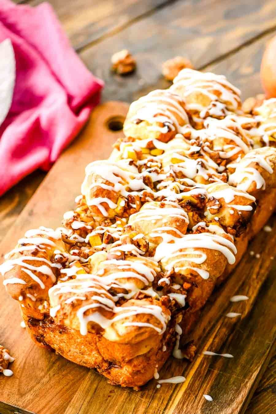 Apple Pull Apart Bread is a delicious fall recipe filled with our favorites! It's soft pull apart bread made from dinner rolls that's loaded with apples, brown sugar, walnuts, cinnamon and butter! Then topped with a homemade powdered sugar glaze. Perfect for a snack, breakfast or dessert. Everyone will be fighting over the last piece.