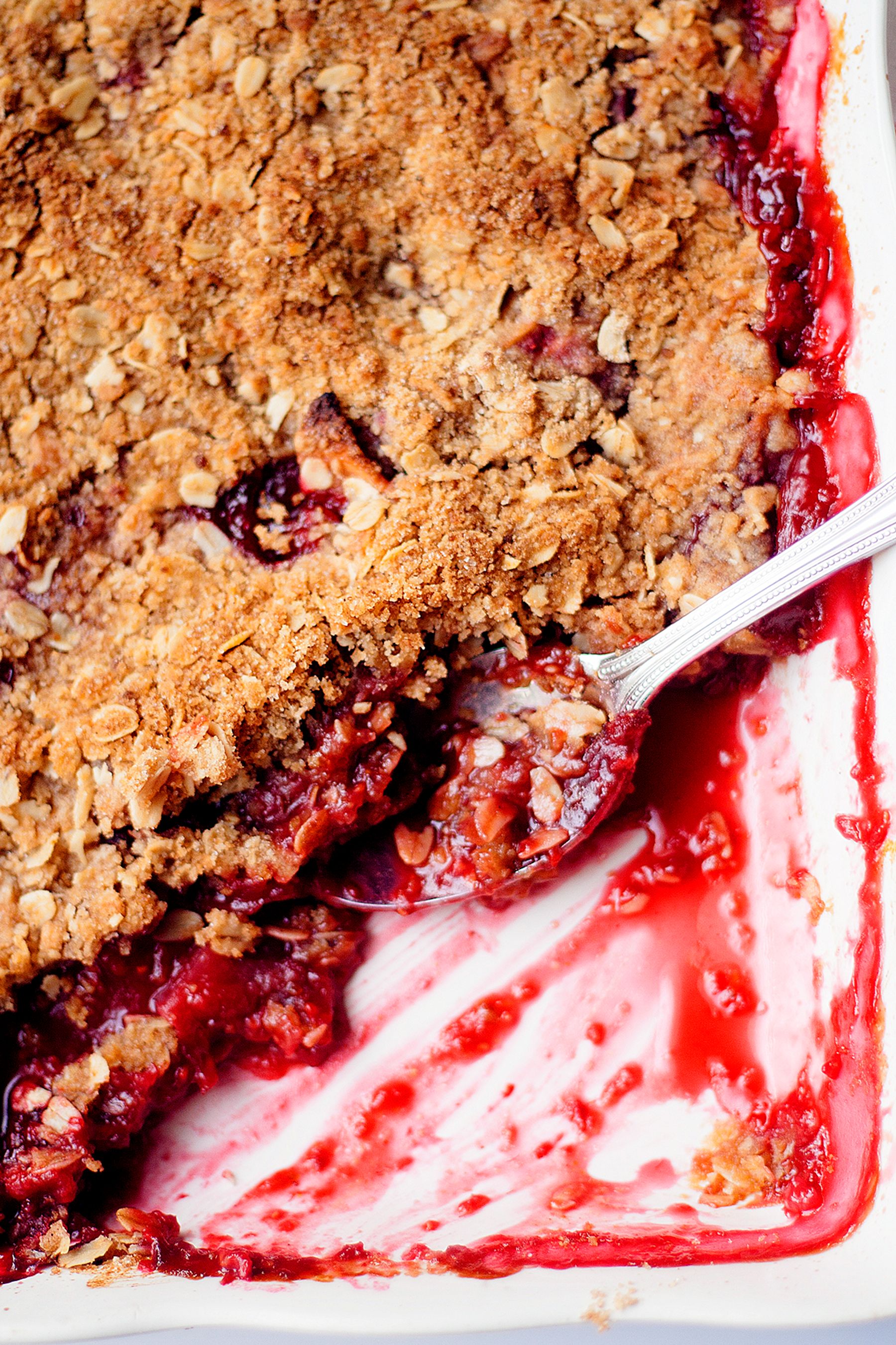 apples and raspberries tipped with a delicious crisp for a fun holidy dessert