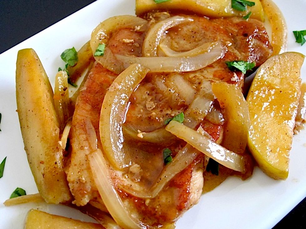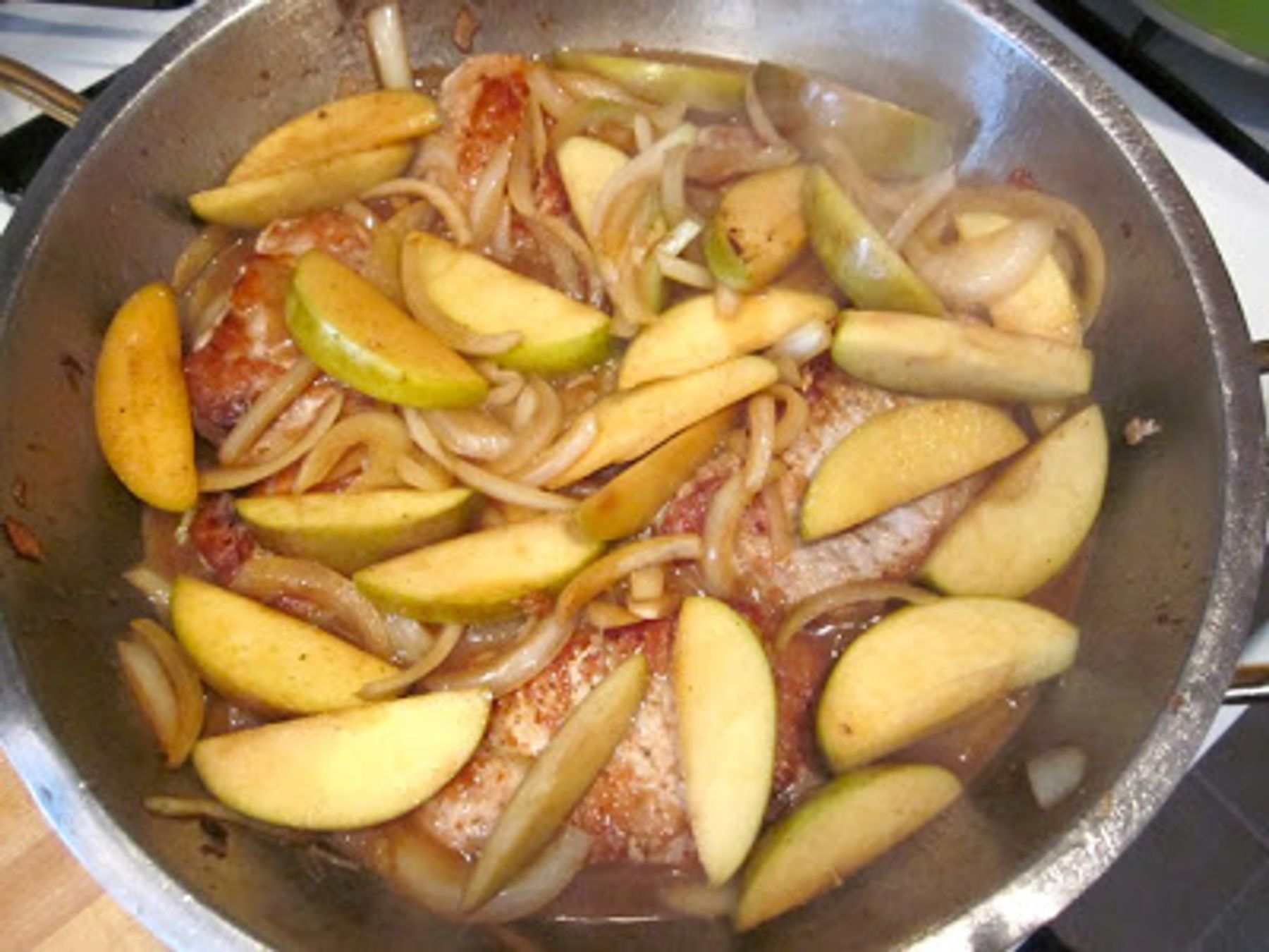 Simmer the chops in the apple/onion mixture for about 10-15 minutes or until the liquid has reduced by half.