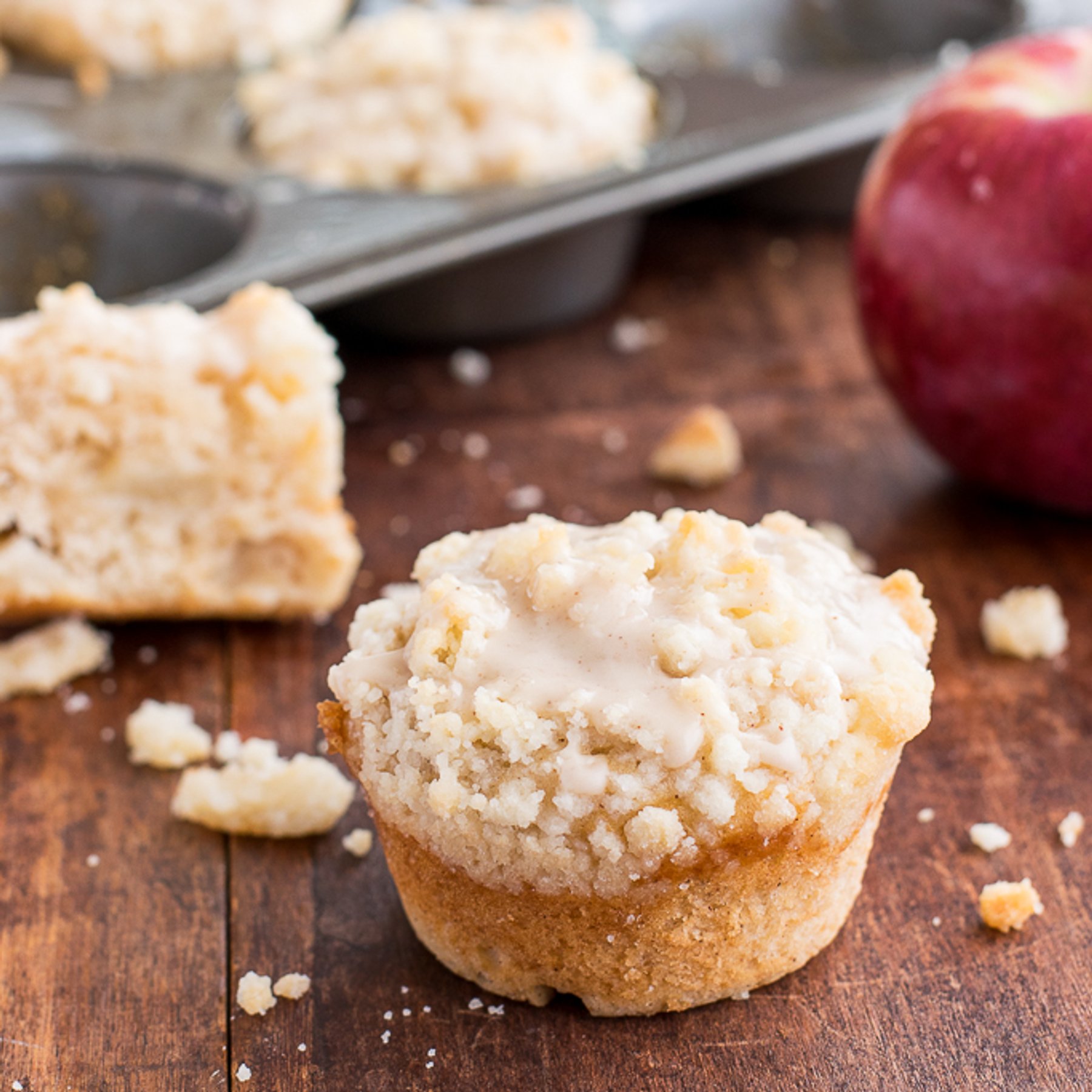 A bakery style spiced apple muffin with a buttery streusel topping and an apple pie spiced glaze.