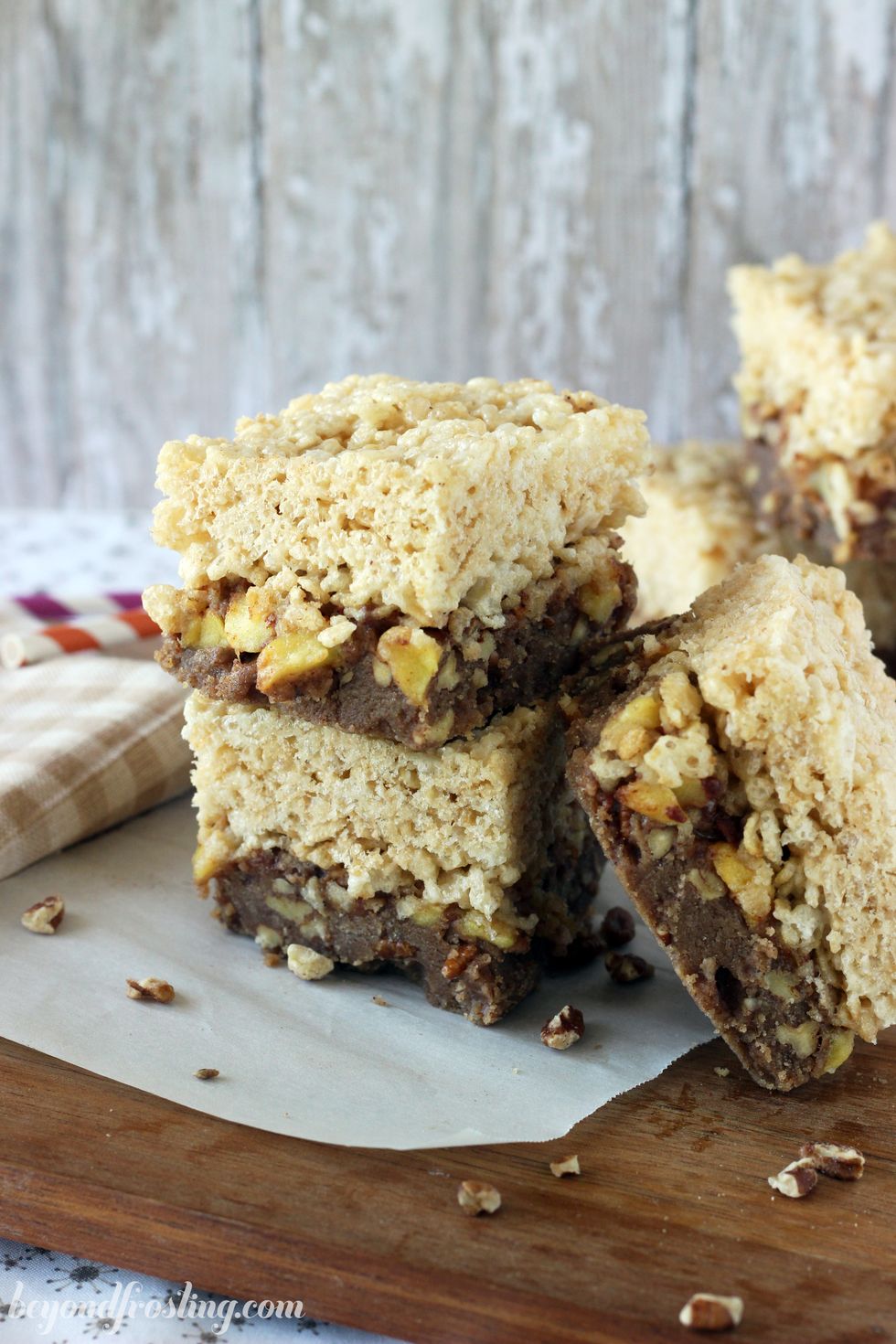 A thick layer of streusel on the bottom, with apple pie filling and topped with a layer of Rice Krispies Treats.