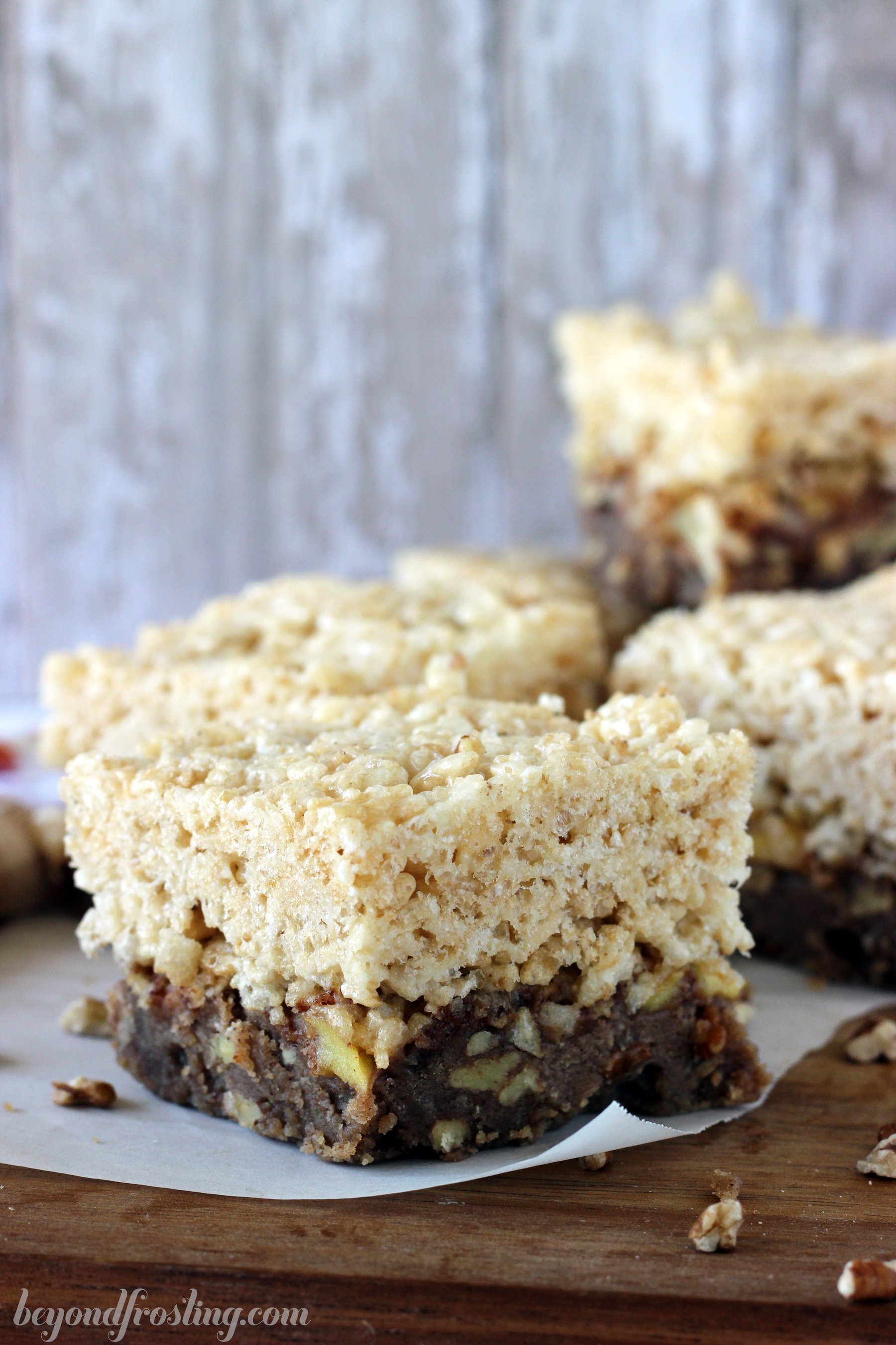 A thick layer of streusel on the bottom, with apple pie filling and topped with a layer of Rice Krispies Treats.