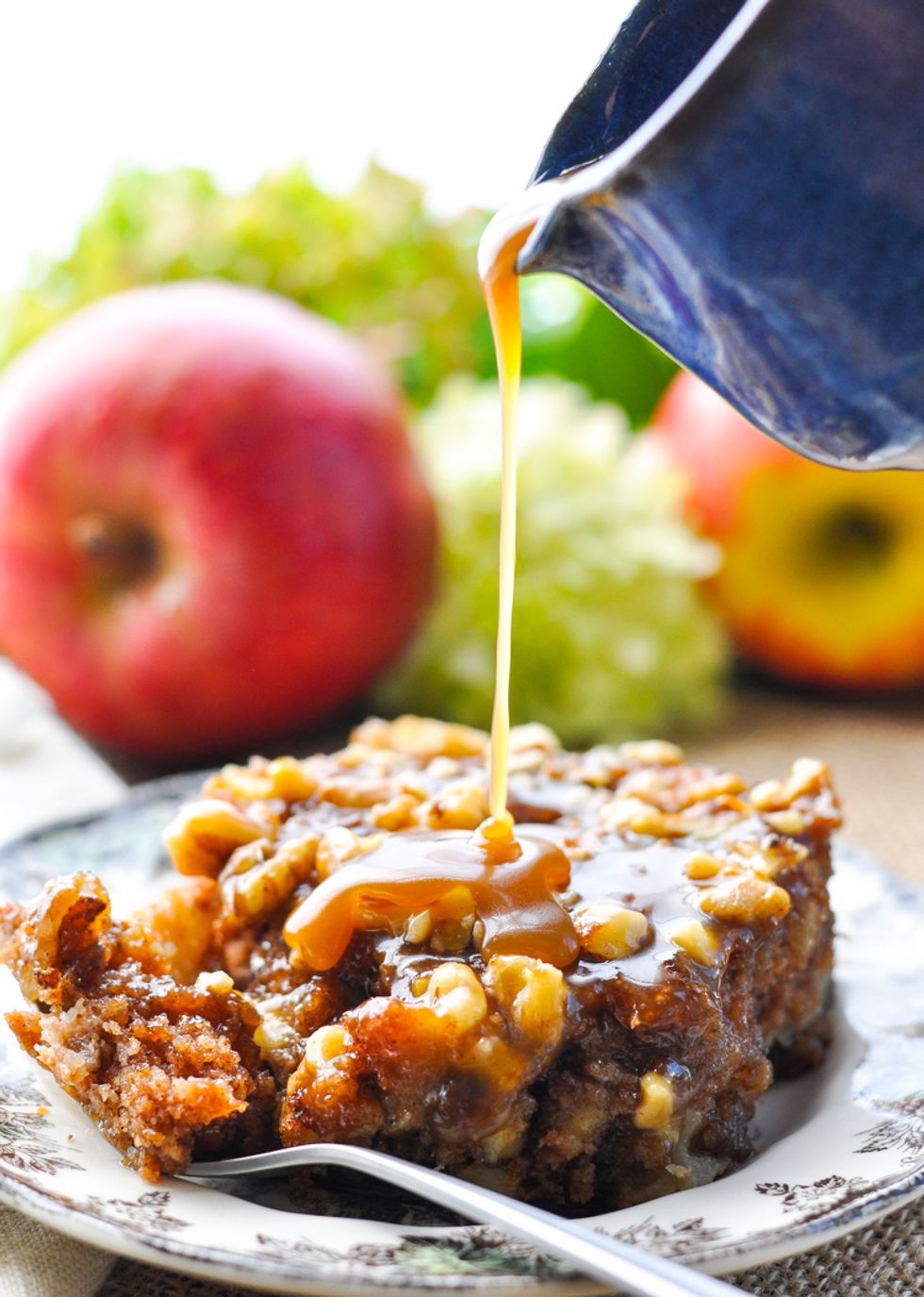 This fresh Apple Walnut Cake with a buttery caramel glaze has all of the warm spices, toasted nuts, and sweet fruit that you crave in a cozy fall dessert. Serve the old-fashioned caramel apple cake with a scoop of vanilla ice cream or a dollop of whipped cream for an easy, festive addition to your next meal. It's moist, gooey, and perfect for the season!