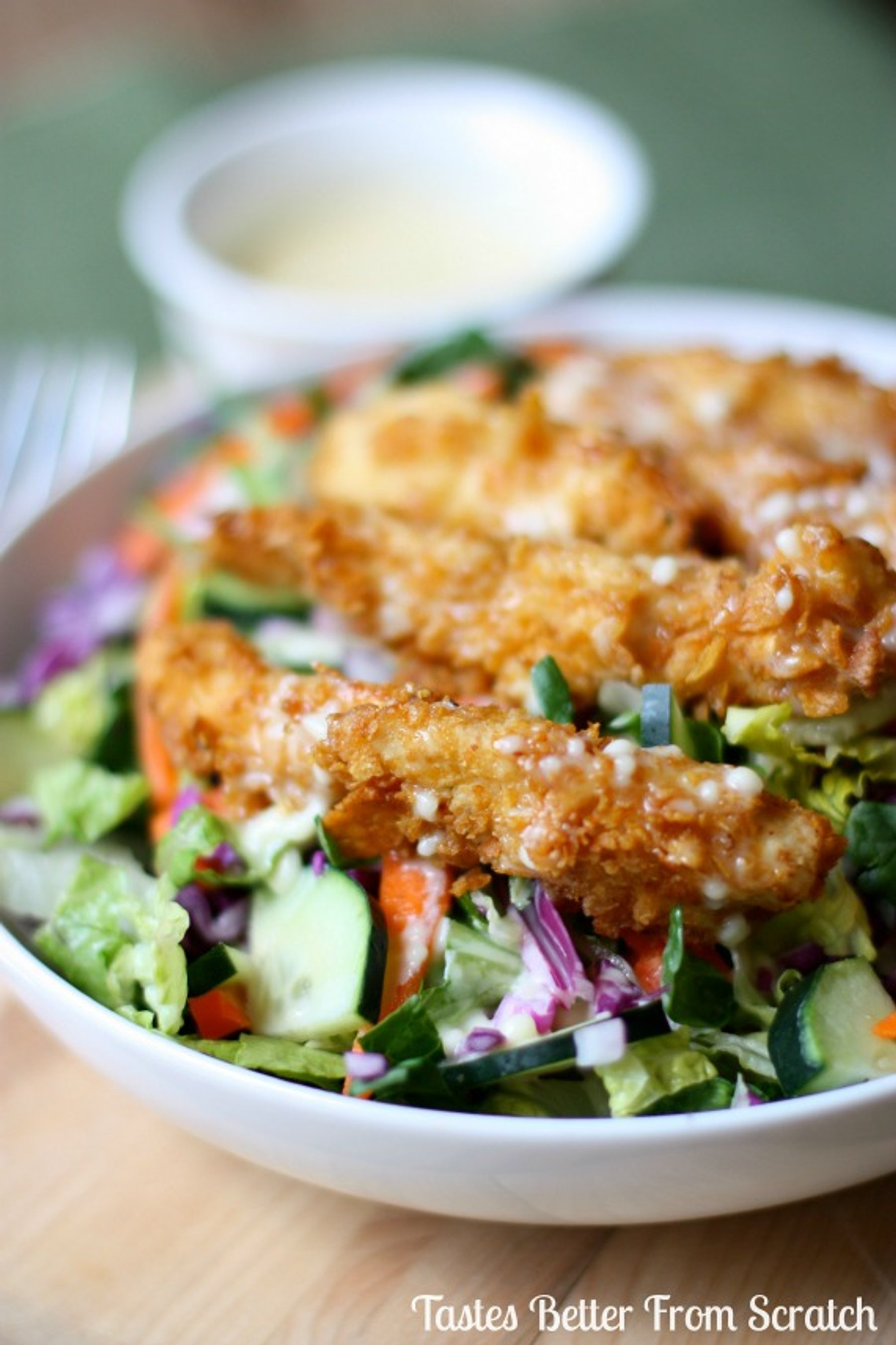 A crispy bed of greens and veggies topped with crispy, cornflake crusted chicken and a sweet oriental honey mustard dressing!