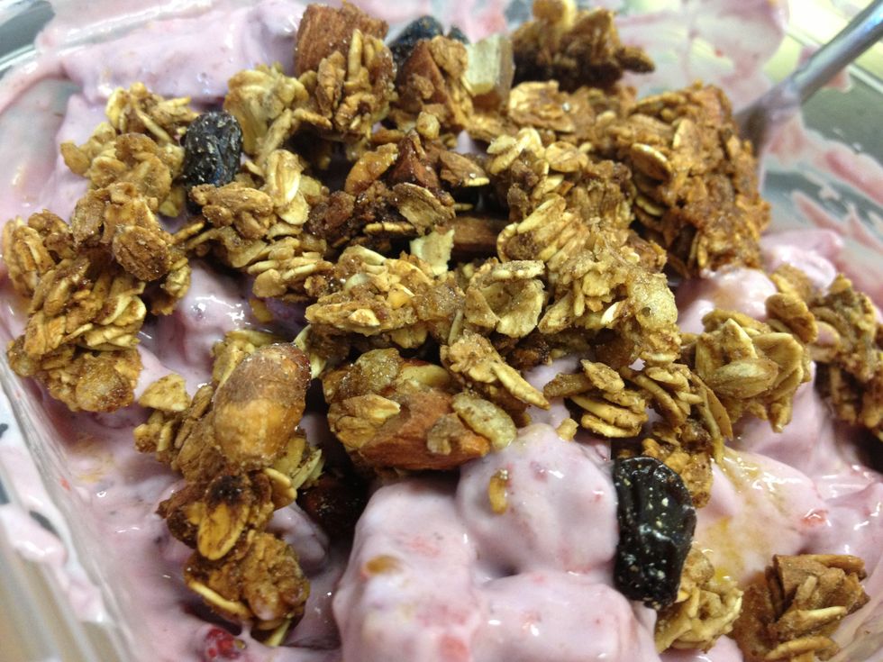 A delicious combination of oats, nuts and dried fruit, with the addition of puffed rice cereal for crispiness. Applesauce is used with the oil to help hold everything together, and keep it on the healthier side.