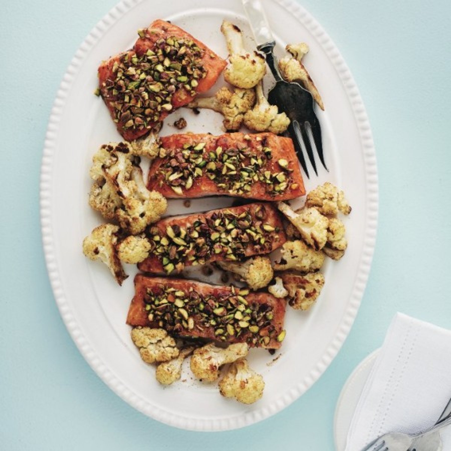 For those nights you’re craving sweet and savoury, opt for these baked salmon fillets with golden florets of roasted cauliflower.