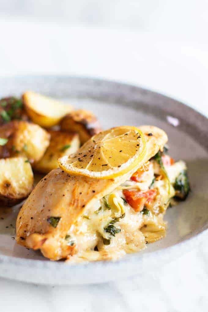 Healthy Baked Spinach Artichoke Stuffed Chicken Breasts, filled with a cheesy and flavorful mixture. These easy baked chicken breasts come out juicy, and are sure to be a hit at the dinner table!