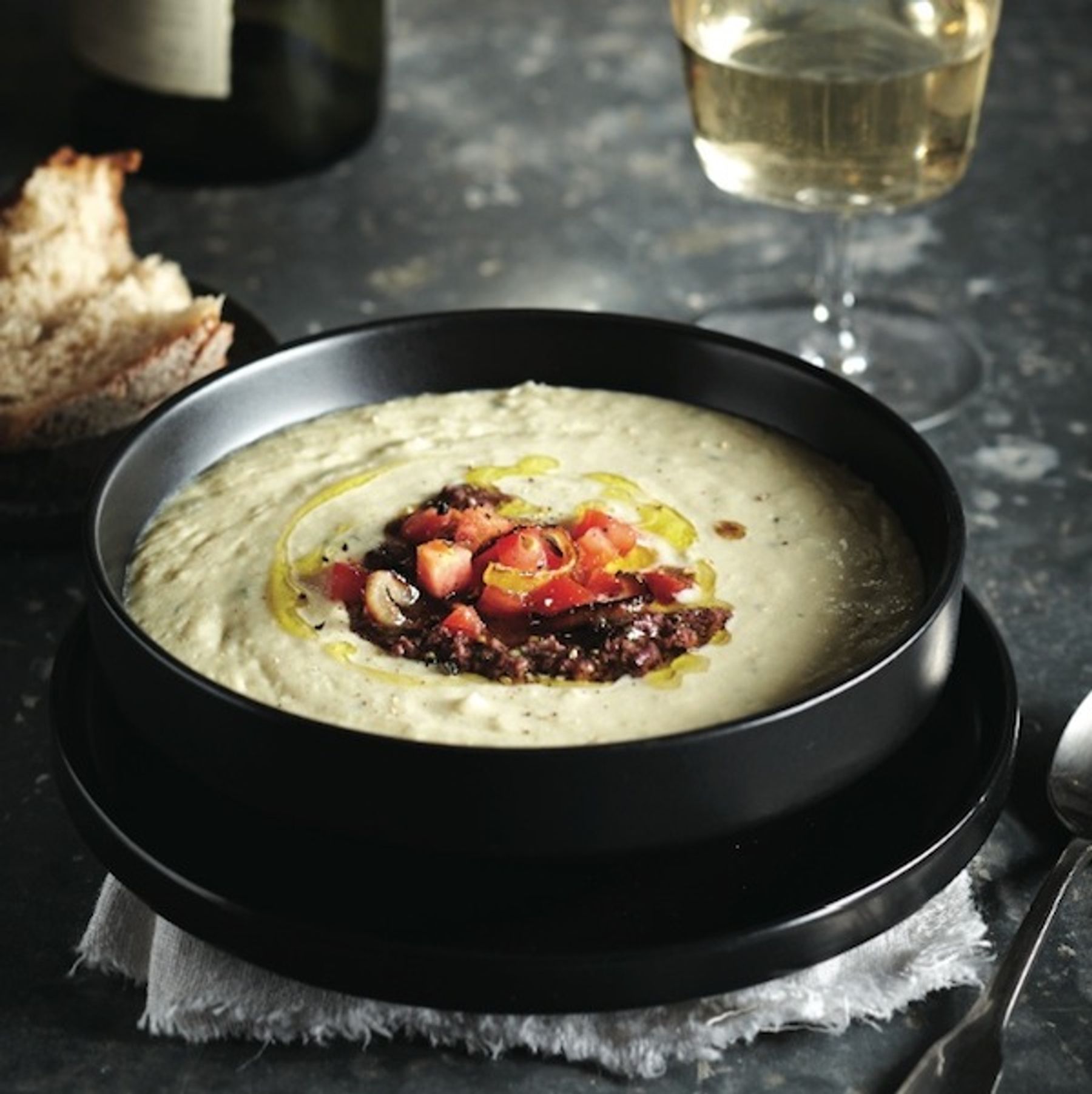 HEAT a frying pan over medium-high. Toss onion with oil, then arrange in 1 layer in very hot pan. Cook until onion is charred, 2 to 3 min per side. Garnish soup with onion, tapenade and tomato.