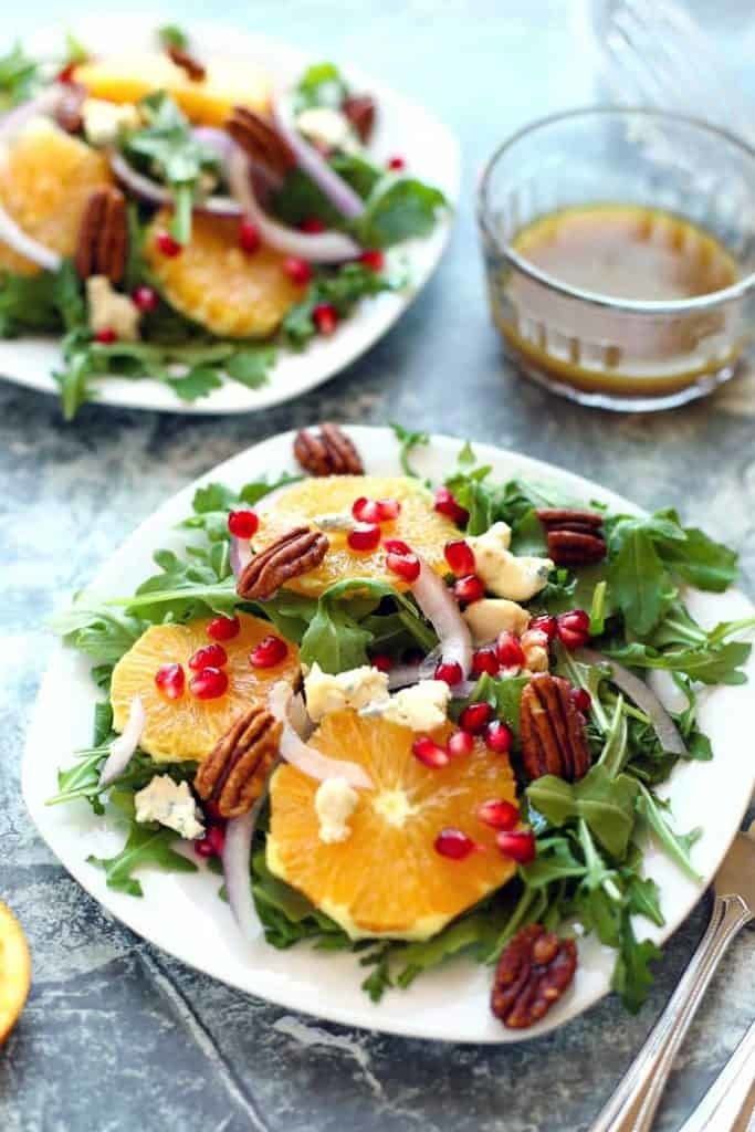 This Arugula and Orange Salad is filled with sliced oranges, pomegranate seeds, red onion, and blue cheese topped with a simple sweet dressing.
