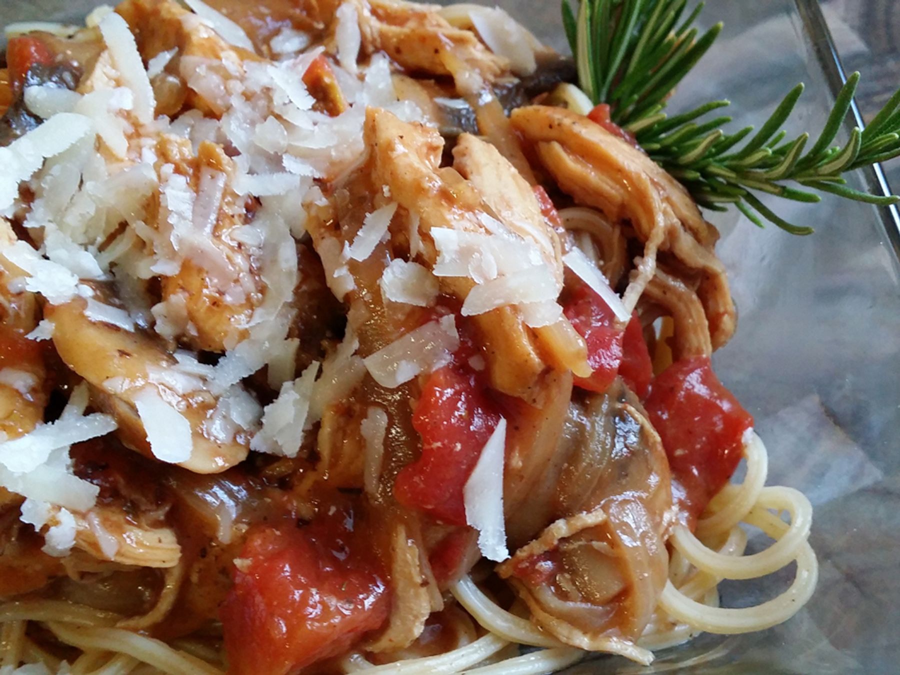 Chicken breasts, tomatoes, rosemary, mushrooms and wine. Oh. my!
