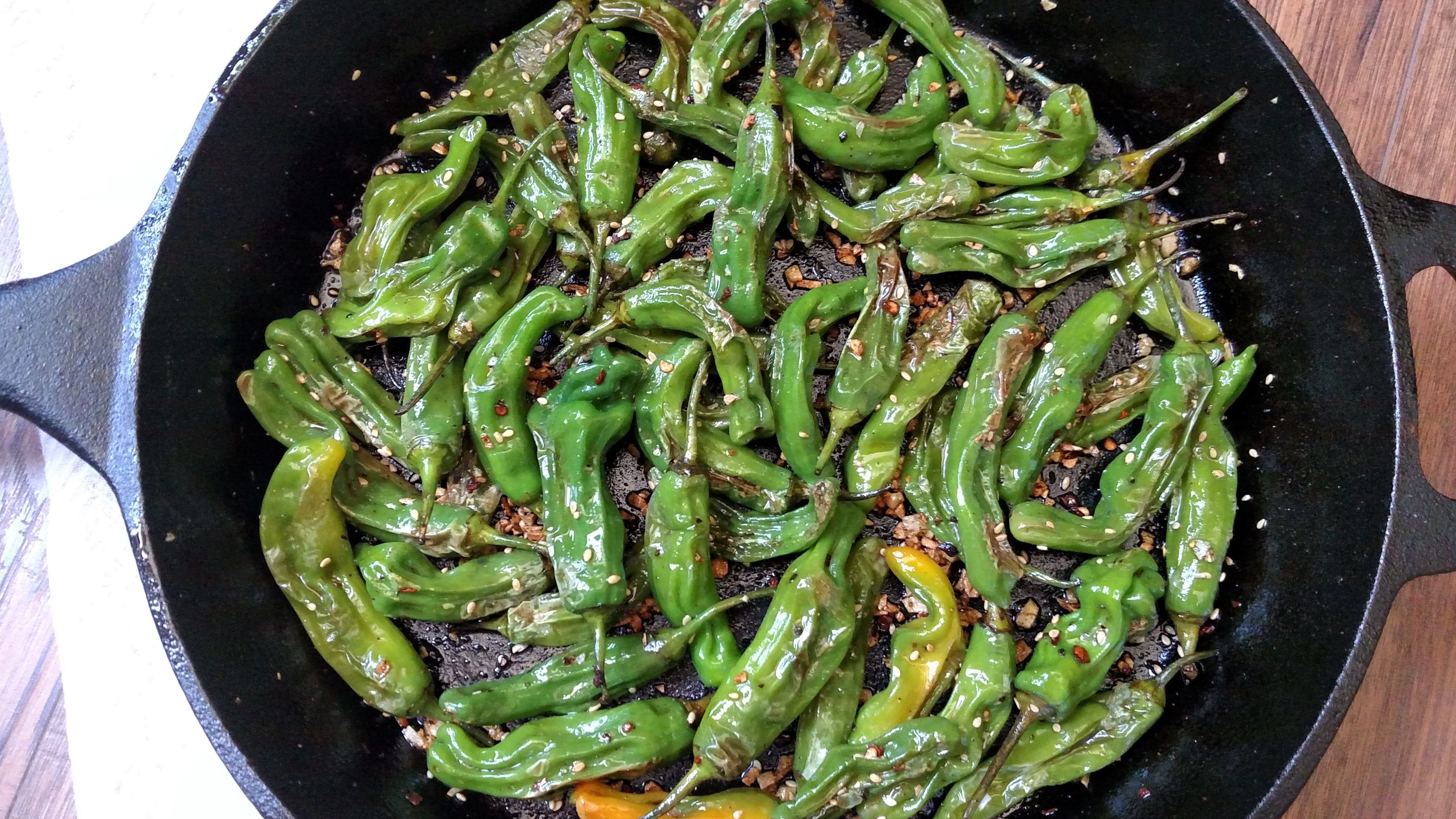 - Heat a cast-iron skillet to med-high heat. Add both types of oil to the pan and when pan is hot, add the shishito peppers. Stir them around so they all have some oil. Season liberally with salt and...