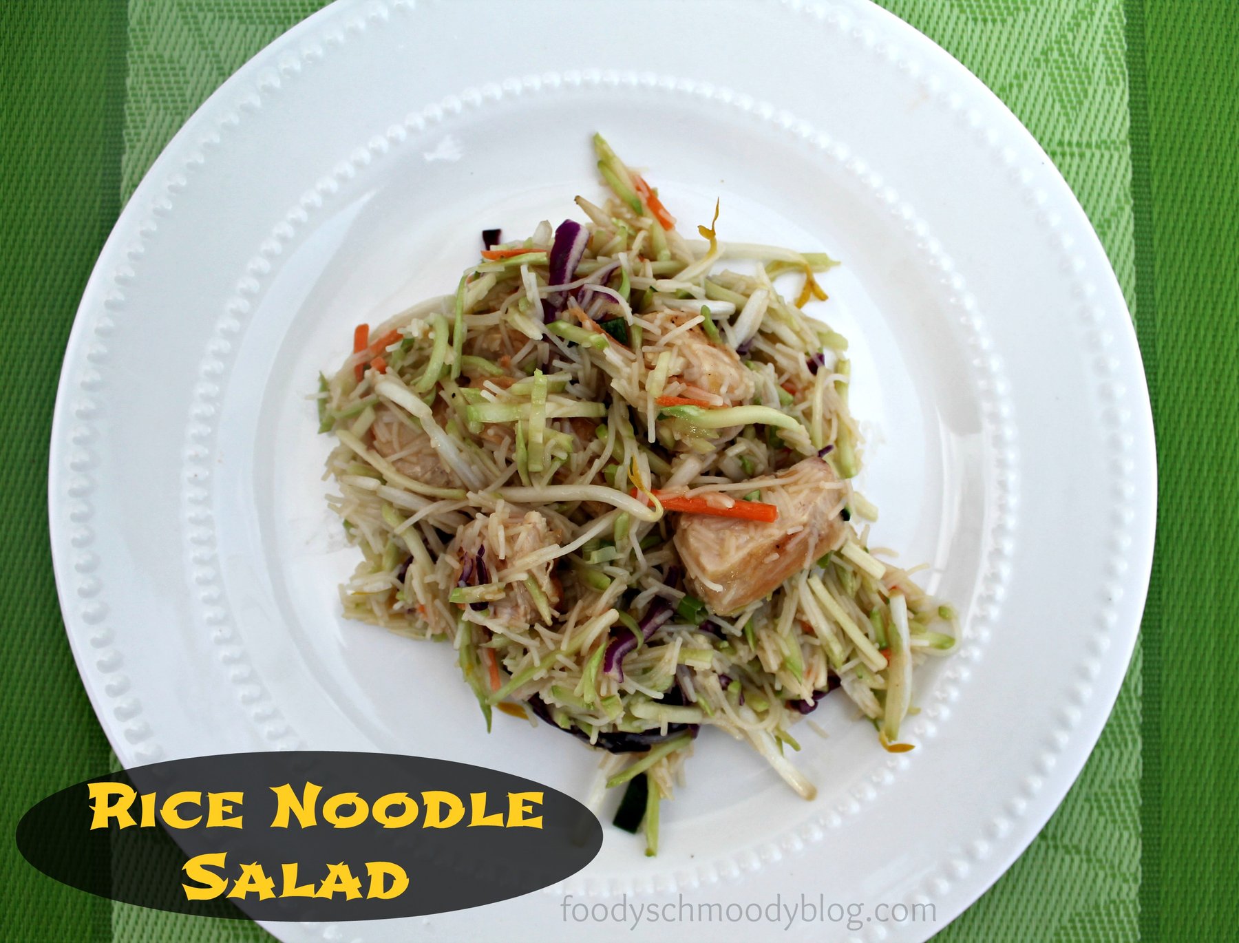 A quick and easy entrée salad, featuring rice noodles and bagged broccoli slaw mix