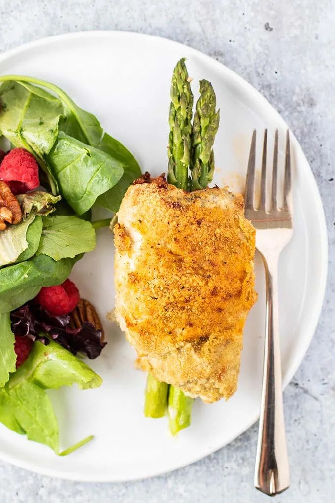 These easy Asparagus Stuffed Chicken breasts are a delicious and easy to make dinner! This keto chicken recipe has a delicious asparagus and mozzarella filling, and is lightly coated in a flavorful almond flour mixture. A delicious baked stuffed chicken recipe!
