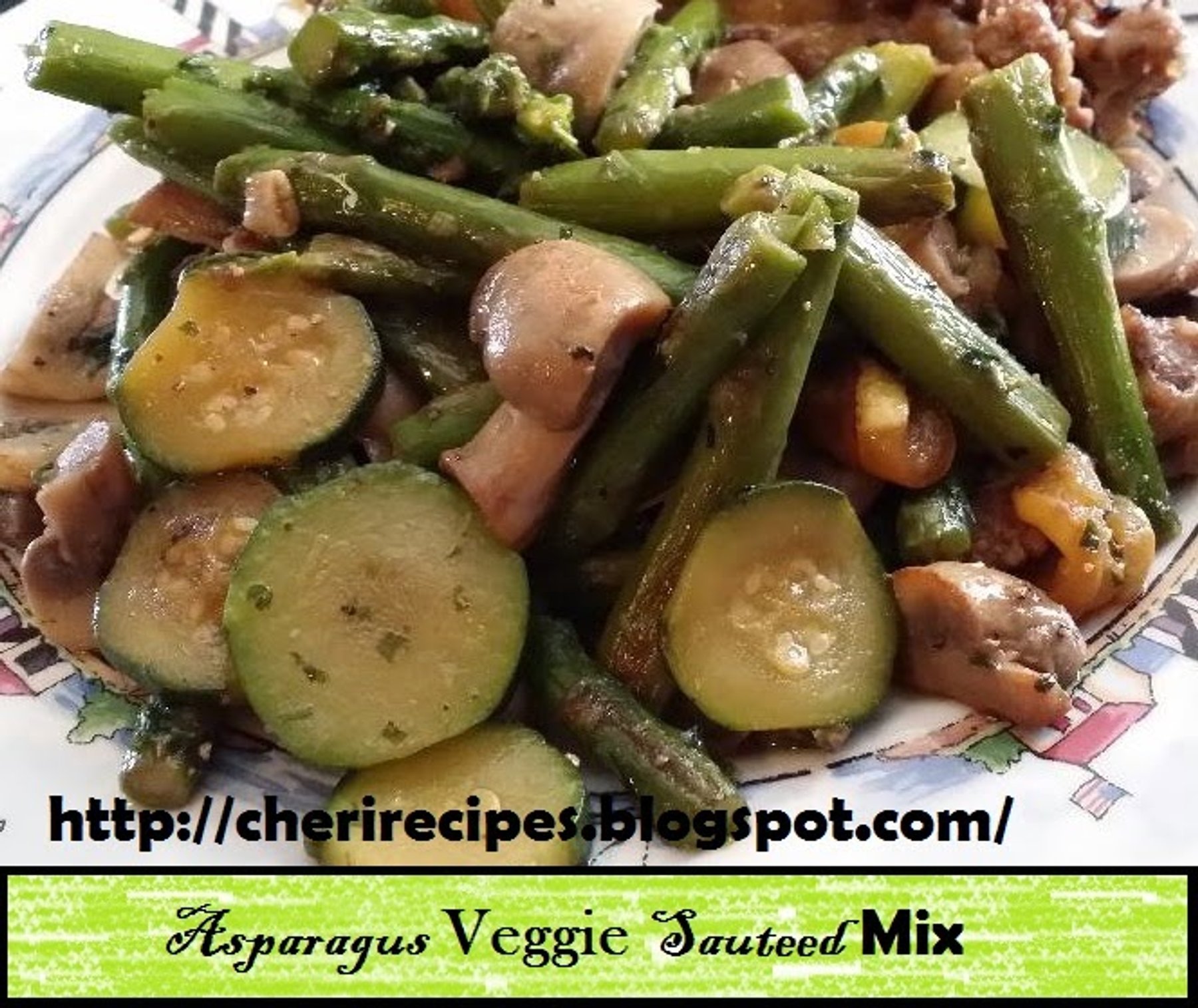 This vegetable Dish has Asparagus, Mushrooms, Zucchini, Squash and Onions with just the right mix of Spices Sauteed to Perfection a good side dish to get your family to eat their veggies and really Enjoy them.