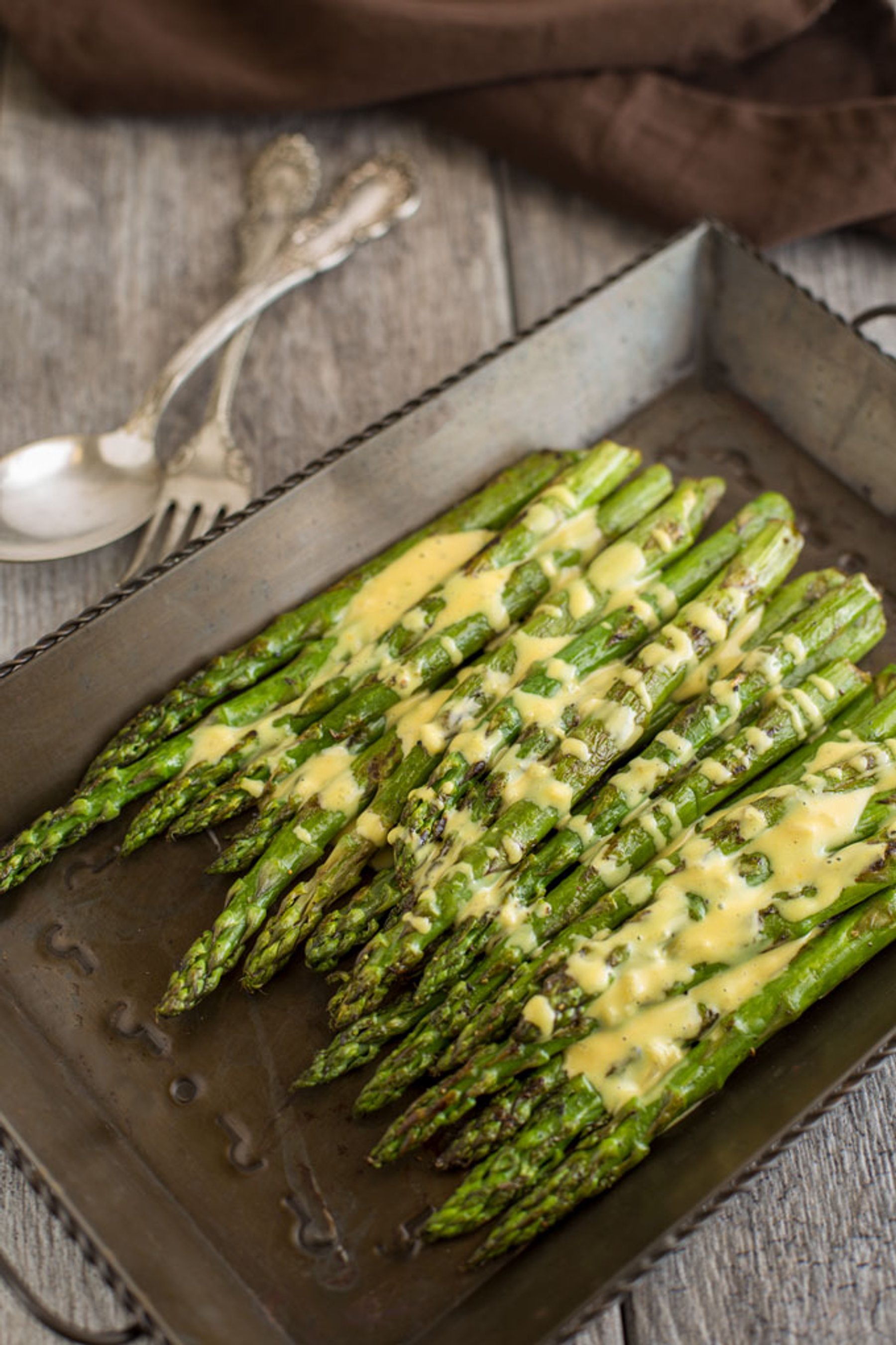 A light, creamy sauce, with the tang of mustard and the smoky sweetness of pure maple really make the fresh asparagus shine.
