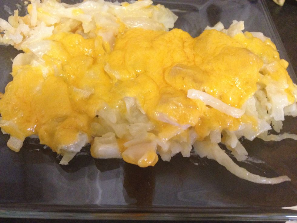 2. Spread frozen hash browns into the bottom of the prepared pan. Mix together potato soup, celery soup, onion, green bell...
