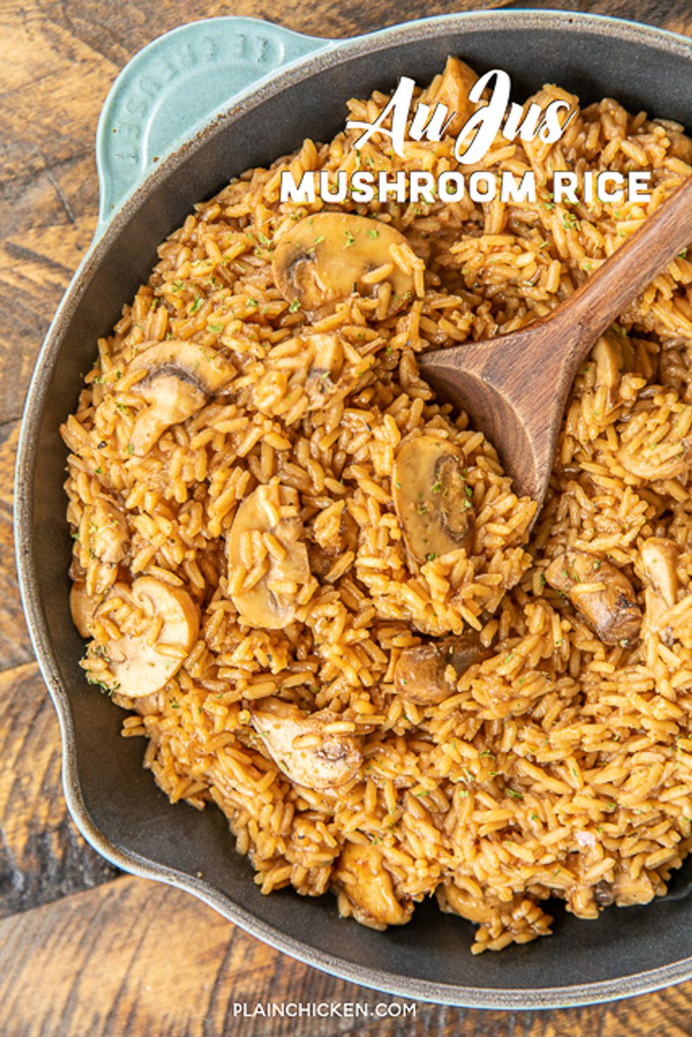 Au Jus Mushroom Rice - seriously delicious! Rice slow cooked in butter, onion, oregano, salt, pepper, beef broth, au jus gravy mix and mushrooms. I could make a meal out of this delicious rice!!! Ready to eat in under 30 minutes! Add some leftover steak, ground beef or pork for a quick main dish. #rice #beef #mushrooms