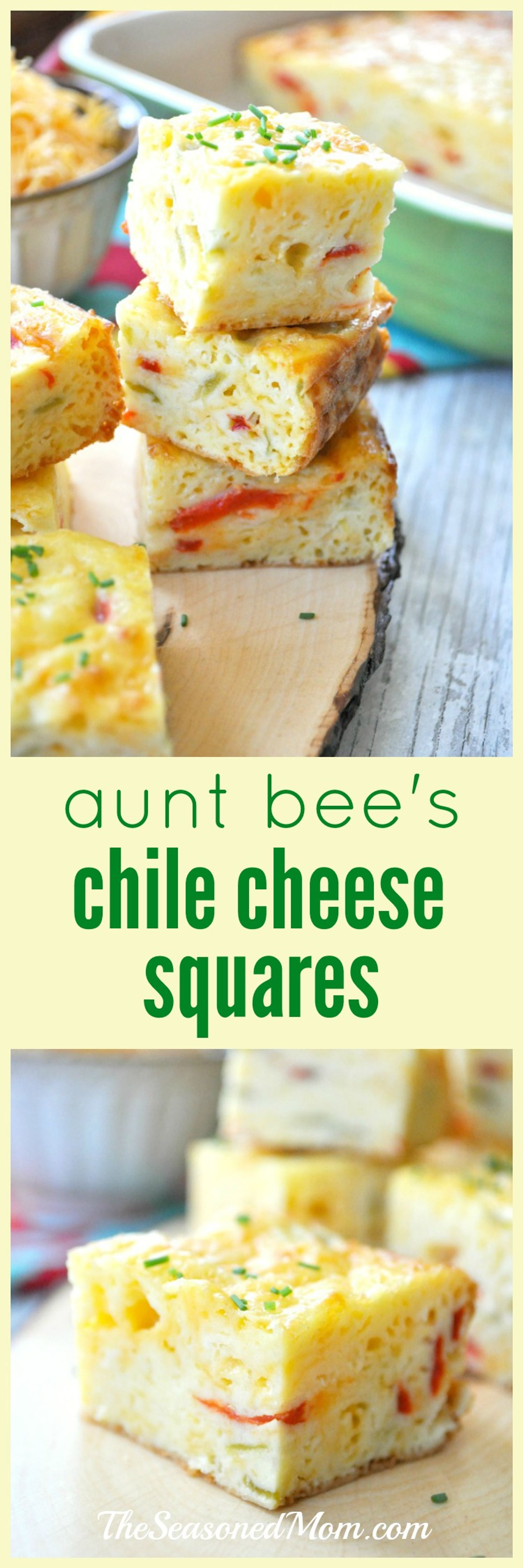 The perfect party appetizer or side dish, Aunt Bee’s Chile Cheese Squares are a simple make-ahead recipe that has been enjoyed for generations! These easy, bite-sized snacks take advantage of a baking mix for an easy, cheesy Southern treat that will disappear fast.