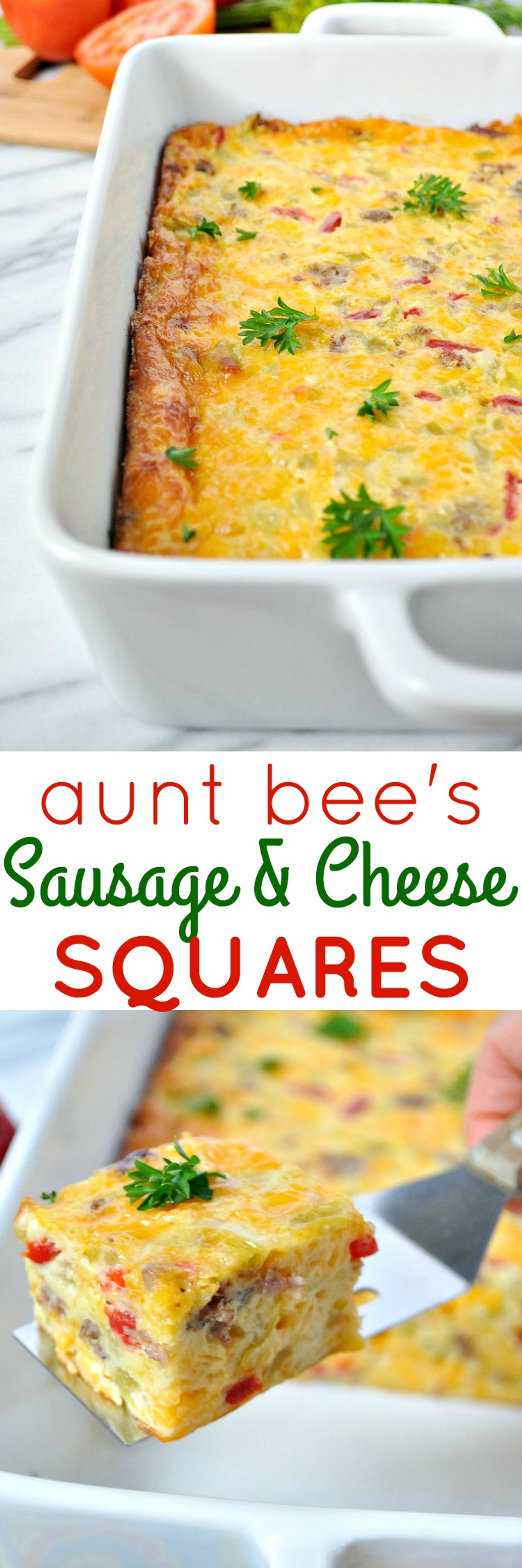 My great Aunt Bee has been hosting southern cocktail parties for years, and this is one of her all-time favorite appetizer recipes! Loaded with cheese, sausage, pimento, and mild green chiles, these Sausage and Cheese Squares are an easy, make-ahead finger food that’s perfect for any occasion!