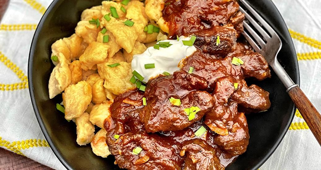 This delicious Austrian stew is made with Fullblood Wagyu shank, paprika, ground caraway seeds, tomato, bay leaves, garlic, onions, and beef stock. This tasty goulash is served with butter-coated dumplings. If you're looking for a comfort dish with tender, flavorful beef, this is the recipe for you!