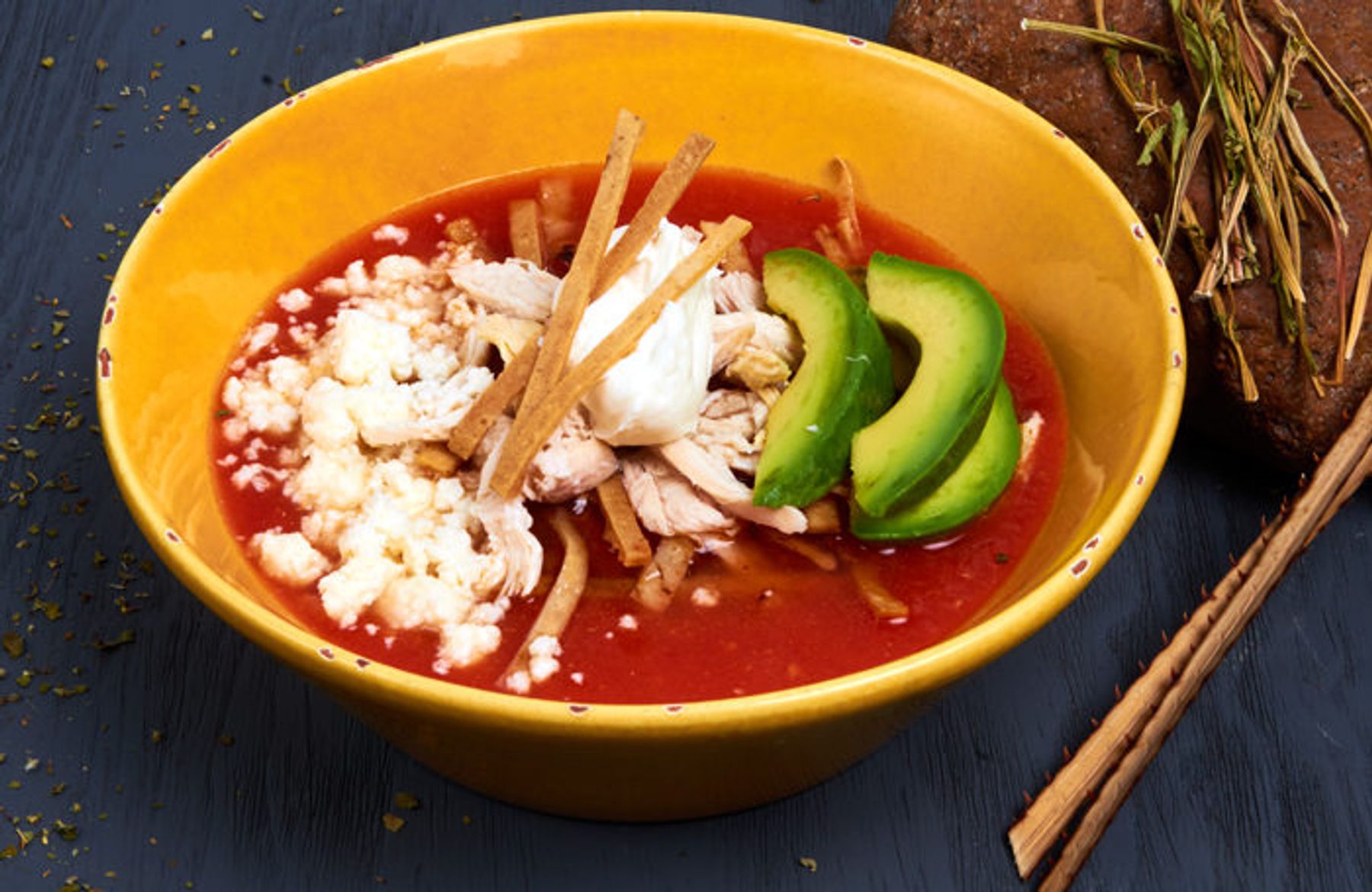 Classic tortilla soup (sopa de tortilla) - shredded chicken in a rich and spicy tomato broth balanced with avocado, cheese and sour cream with tortilla strips added for crunch.