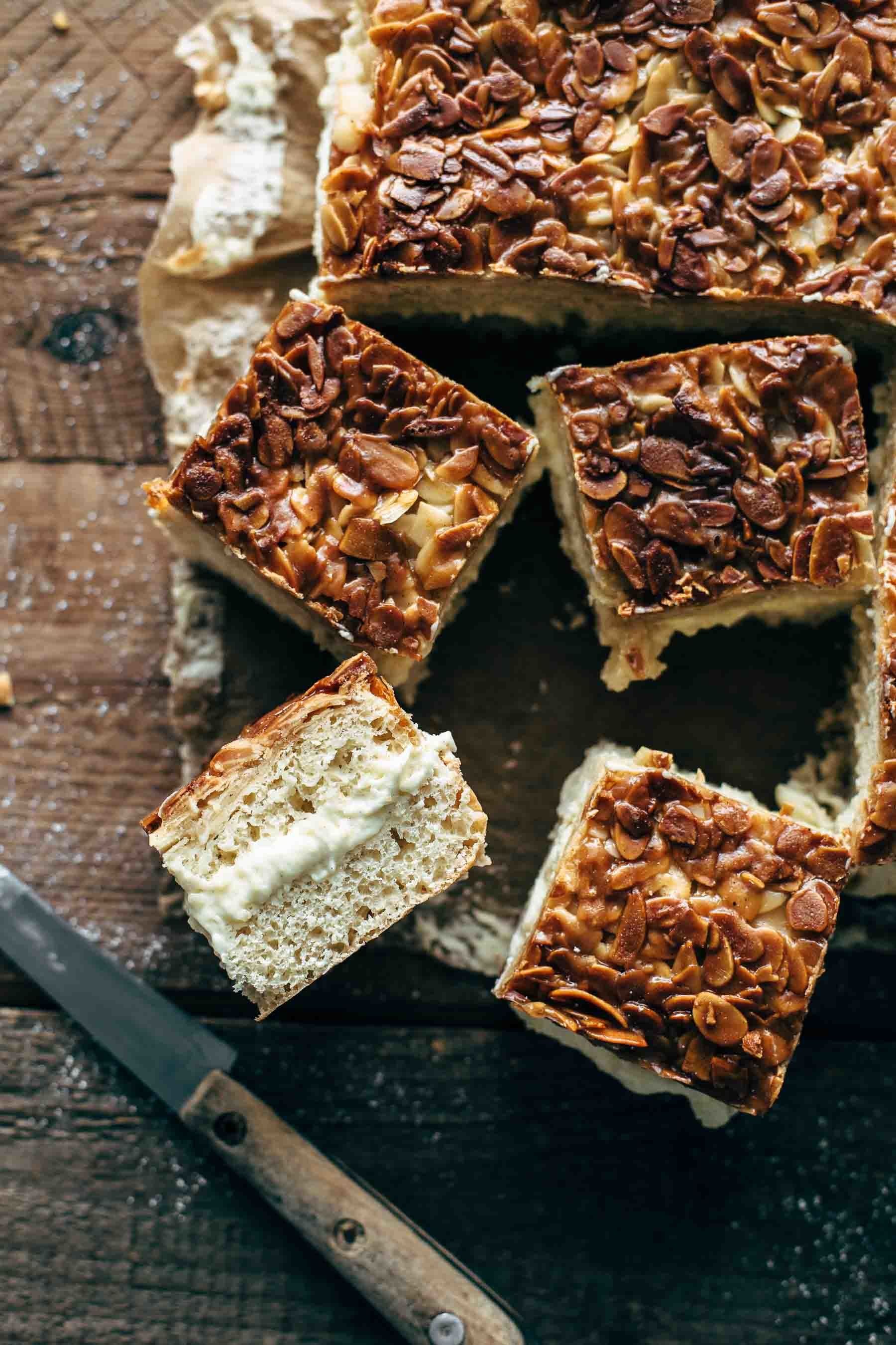 Are you looking for an Authentic German Bienenstich Recipe? This Bee Sting Cake is a German classic and completely translated into English. Soft yeast dough filled with creamy vanilla pastry cream and topped with a crunchy honey almond topping.