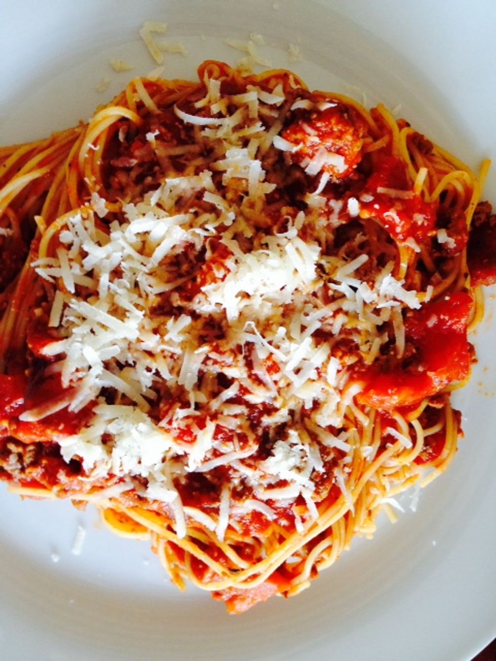 Sauté ground beef and onions.  Drain liquid.  Add remaining ingredients and simmer on low for 2-3 hours.  Easy to freeze for later use.
