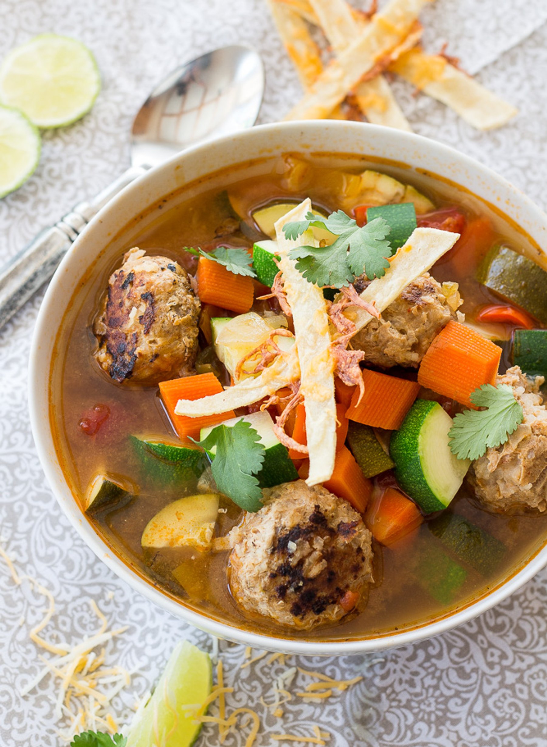 An authentic Mexican soup made with turkey meatballs & vegetables. Pairs amazingly with avocados & homemade cheesy tortilla strips.