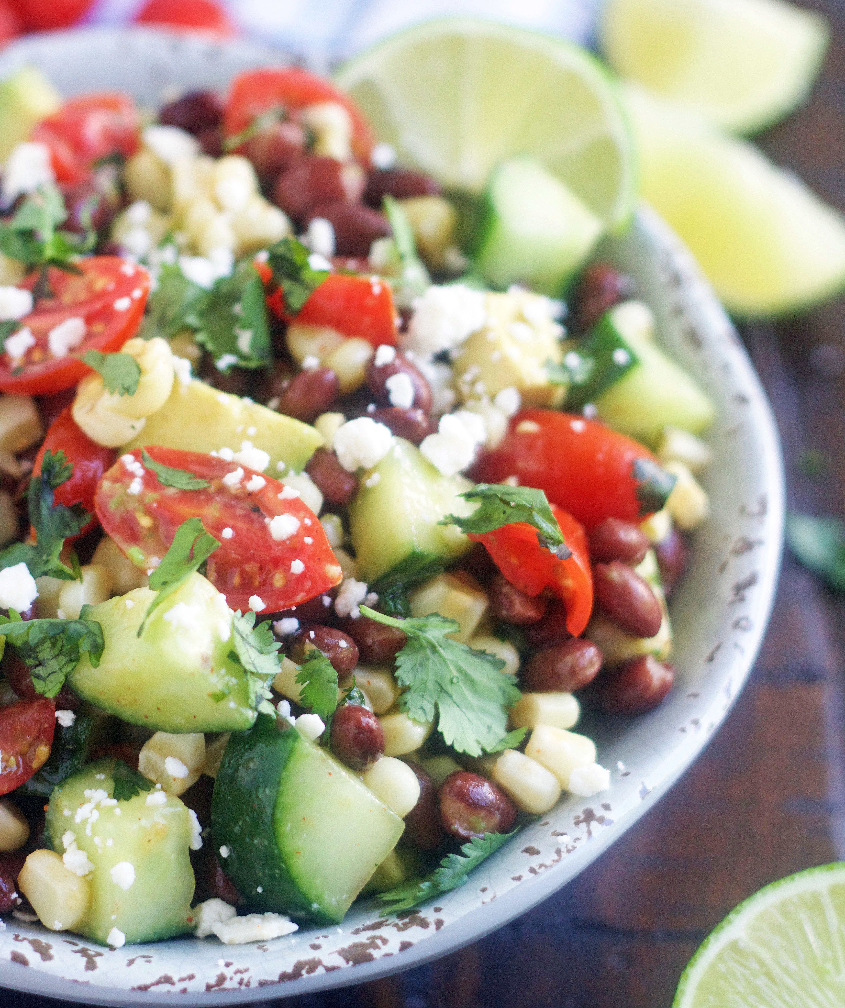 - SALAD: In a serving bowl, combine black beans, corn, cucumber, tomatoes and cilantro and mix well. **Don't add avocados until just before serving. Whisk dressing and pour about half...
