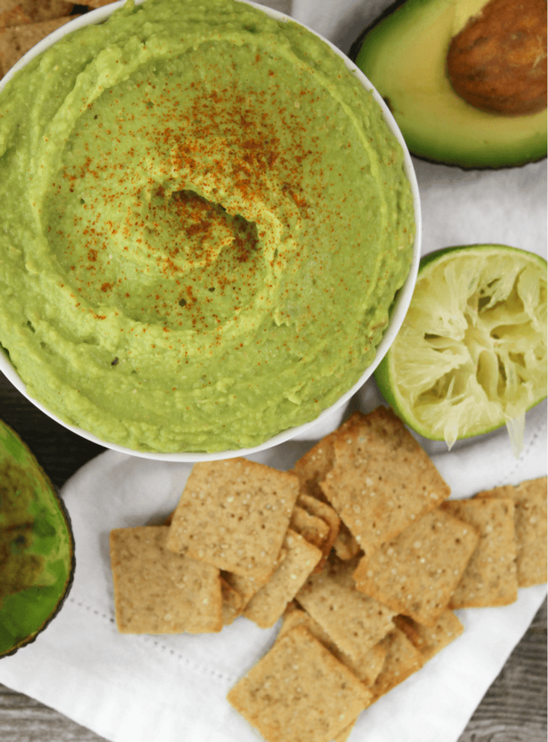 Avocado Hummus made with fresh avocado, lime, olive oil, chickpeas with roasted garlic and jalapeno paired with GOOD THiNS.