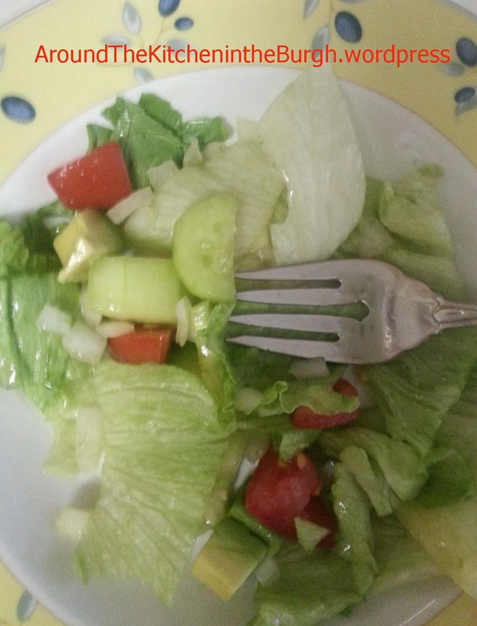 Mix all ingredients except lettuce. I sprinkle a few dashes of the garlic salt. The Garlic salt along with the onion makes a juice which acts like a dressing for the salad. Cover and put in refrigerator...