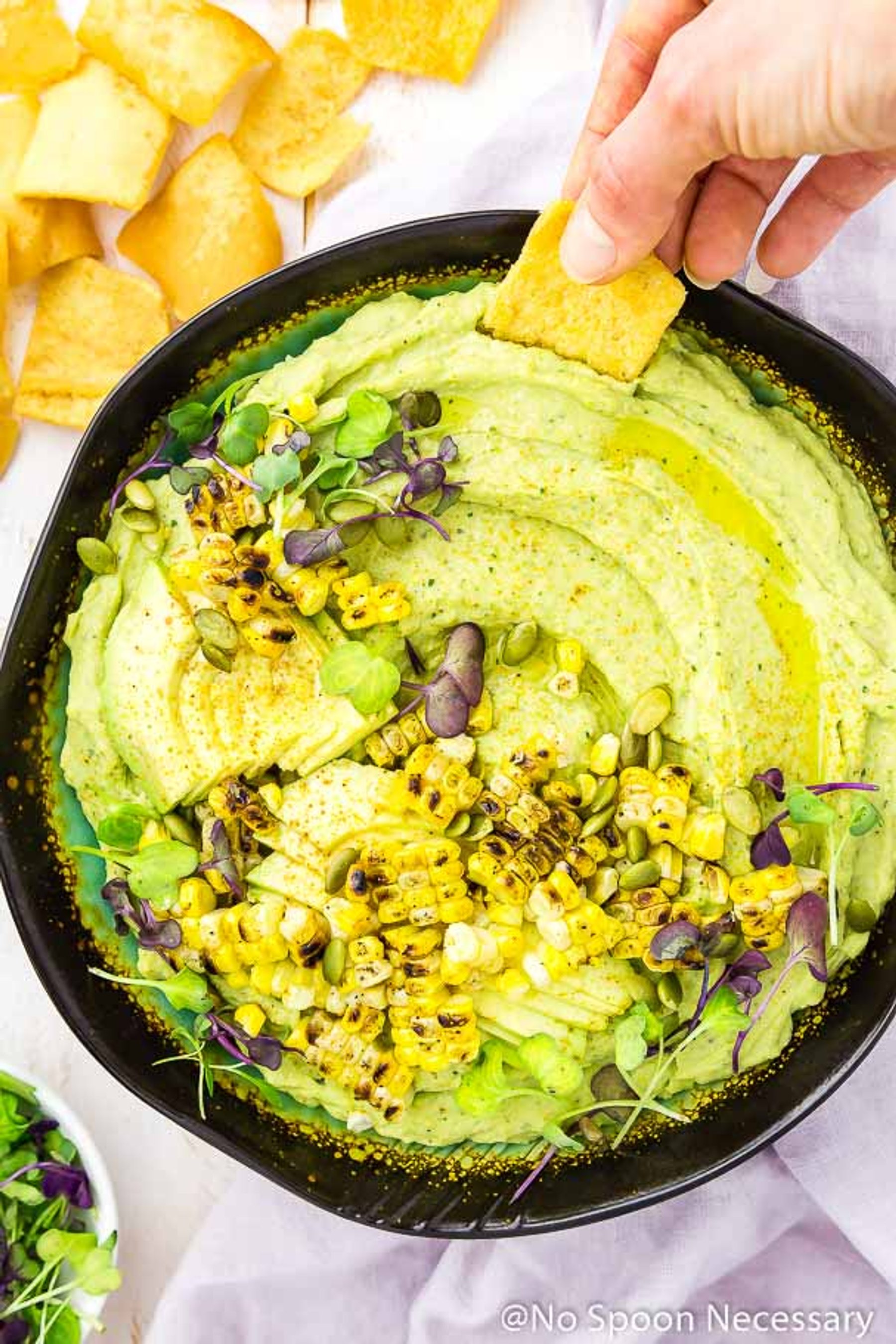 Avocado Sriracha Hummus with Grilled Corn. Silky smooth, creamy dreamy, deliciously healthy and rockin' all the summer vibes!