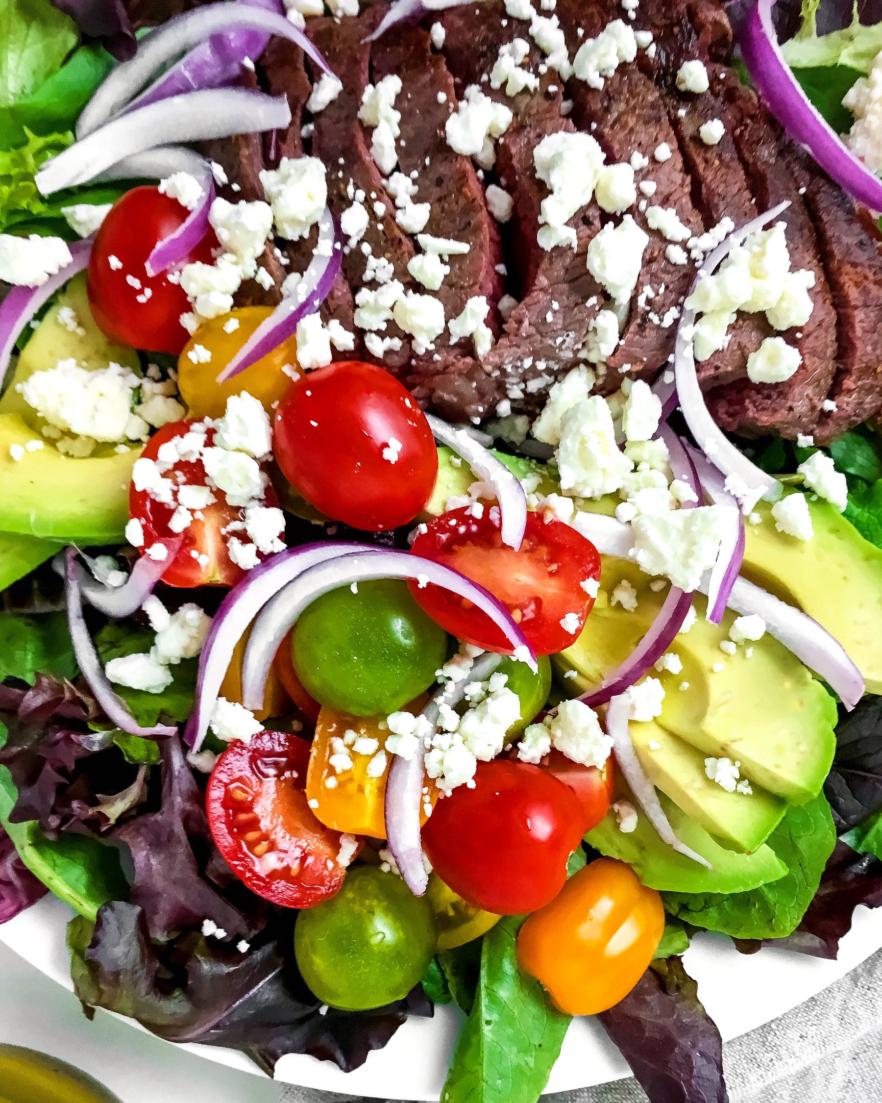 A steak salad with avocado, feta, and the most irresistible sweet and tangy poppy seed vinaigrette - meet your new favorite salad!