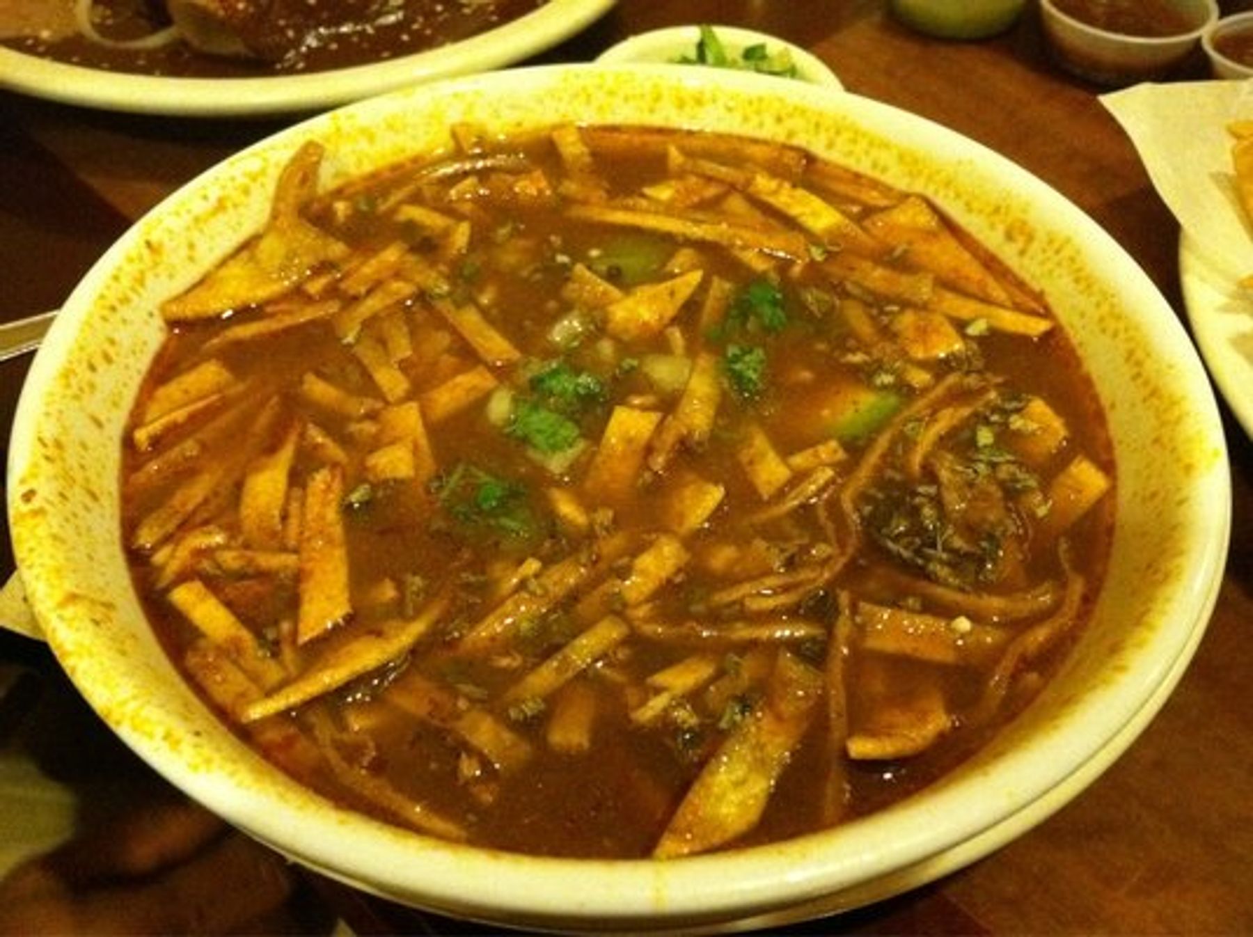 8. Serve by putting a dried chile, some fried tortilla strips, torn spinach, and top with the queso fresco and avocado chunks.