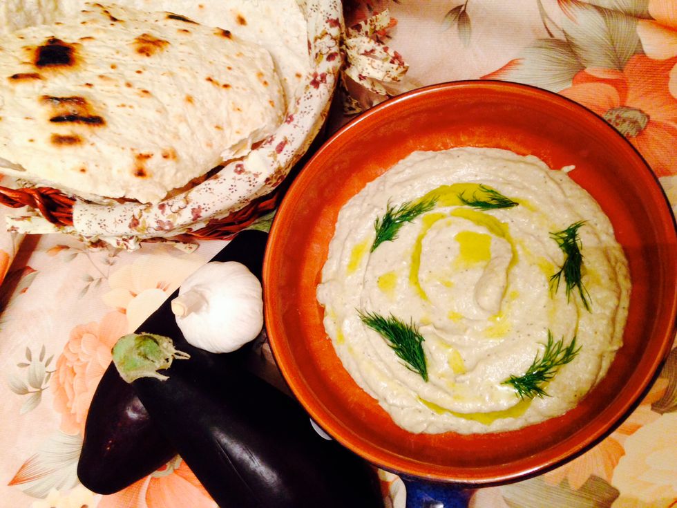 Aubergine & Tahini Dip, served with homemade pita bread.
