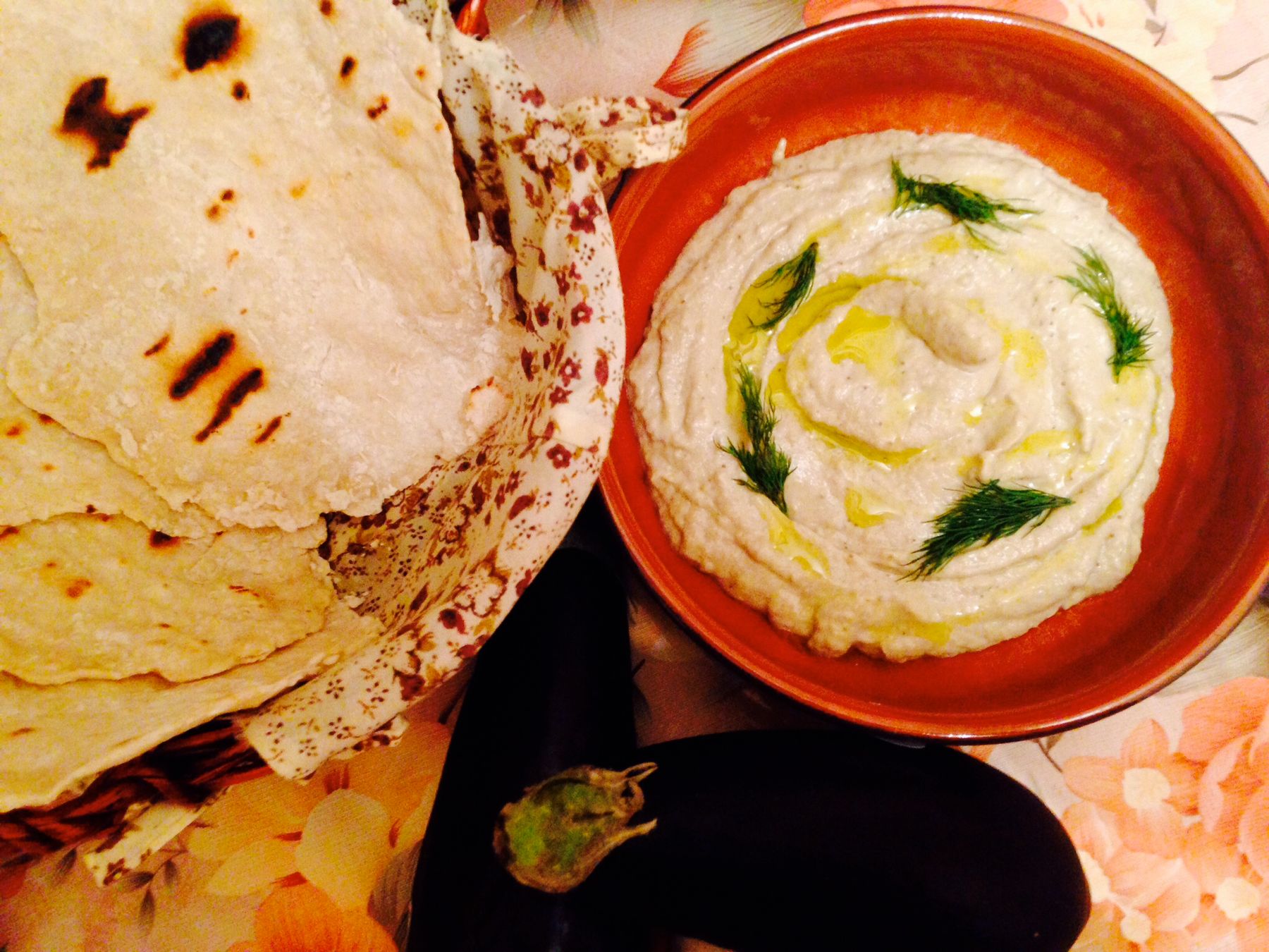 Aubergine & Tahini Dip, served with homemade pita bread.