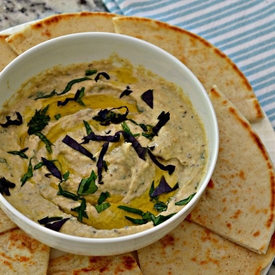 Baba Ganoush is a simple Middle Eastern Dip made with Roasted Eggplant, Tahini, lemon juice, garlic and other delectable seasonings. It is traditionally served with warm pita bread but is equally delicious with crisp raw vegetables like cucumbers, bell pepper, carrot sticks and celery.