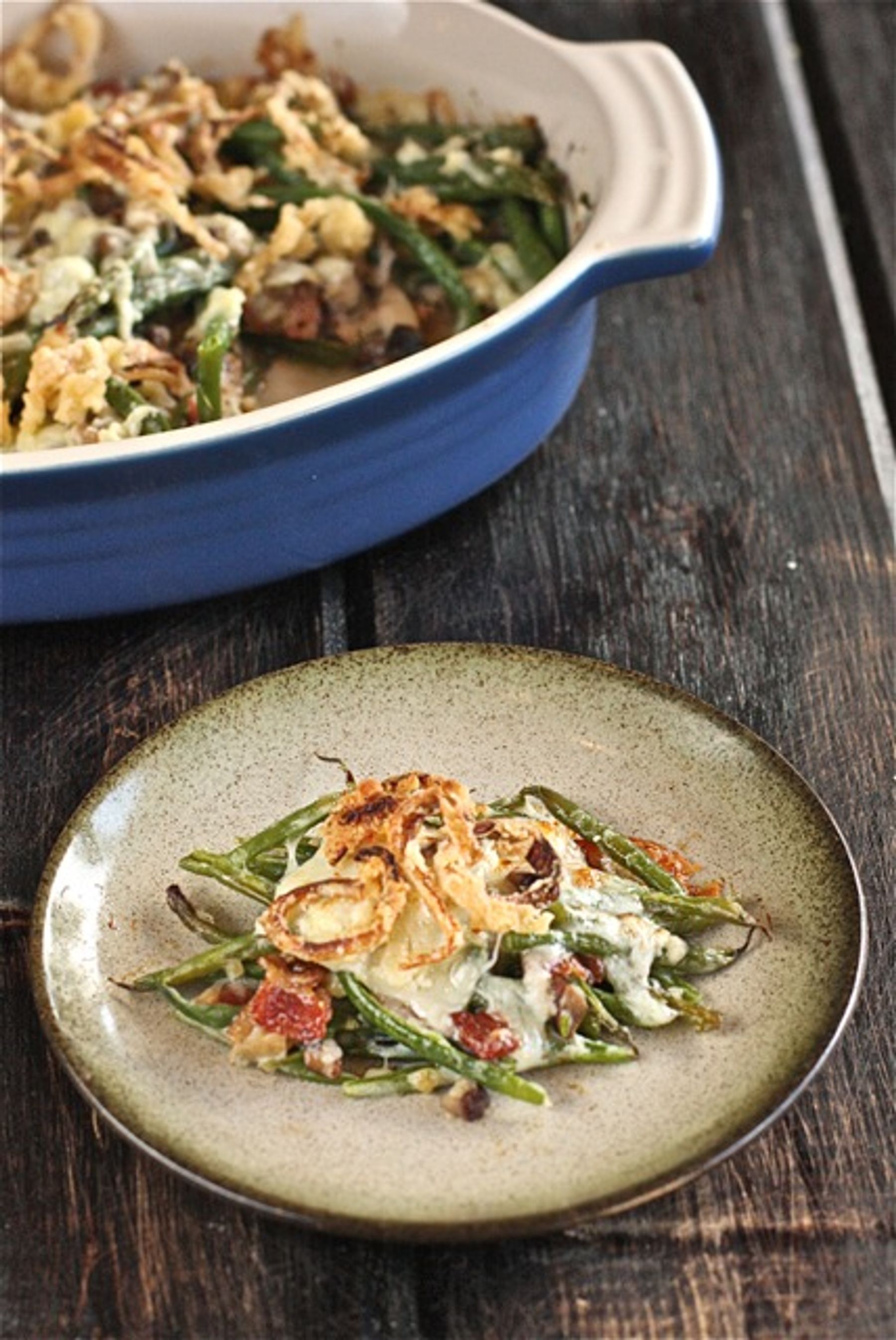 Bacon and Cheddar Green Bean Casserole with Crispy Shallots